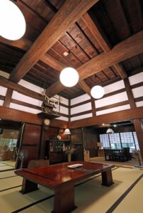 広間は天井のケヤキの梁(はり)組みを見せた重厚な造り。年月を経た建物が古き時代へと思いをいざなう