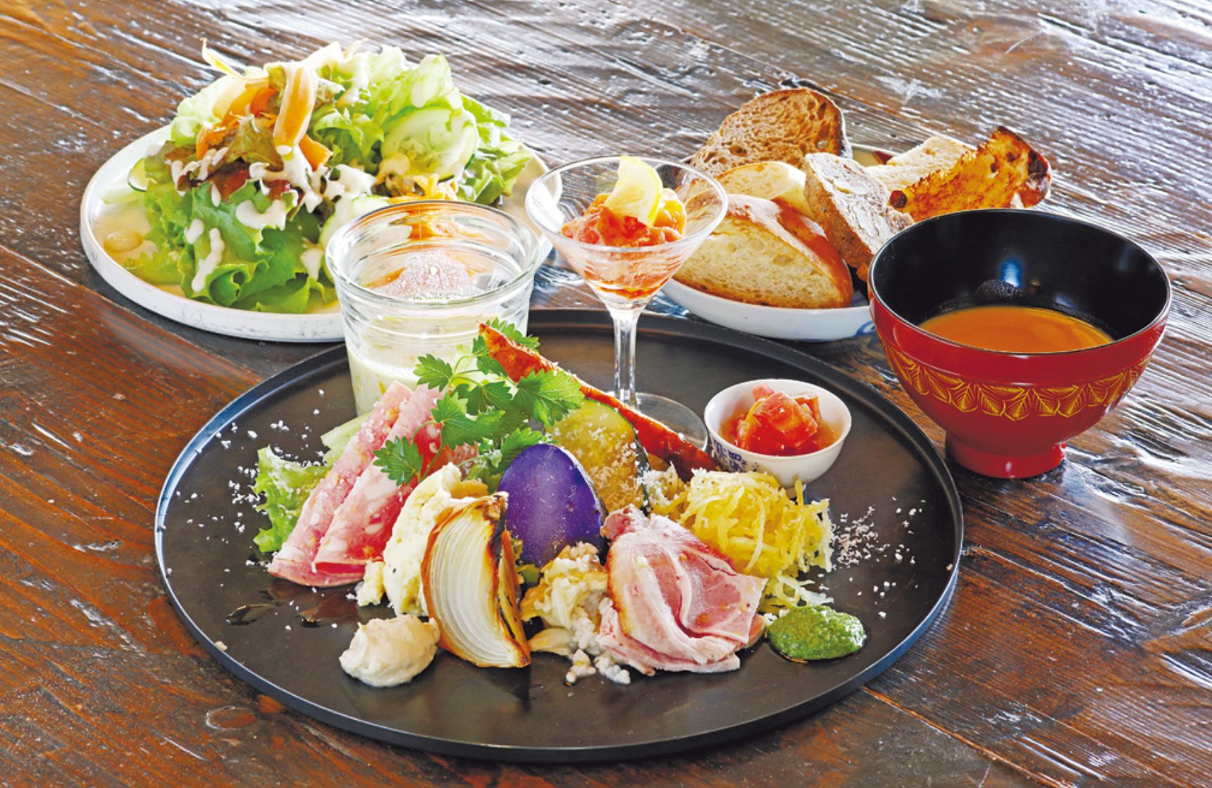 ランチの一番人気は、パン、スープ、サラダと9品の料理を盛り合わせたワンプレートで視覚から楽しませてくれる「WILLOW HOUSE PLATE」。サーモンのこうじ漬け、発酵玉ねぎドレッシングのサラダなど、いずれも発酵の力と食材のうまみを生かした品々で幸福感に満たされる。ランチでは自家製天然酵母で作られた薪(まき)窯パン6種類の食べ比べも可能。体を整える優しい食事で充実のランチタイムを過ごそう。