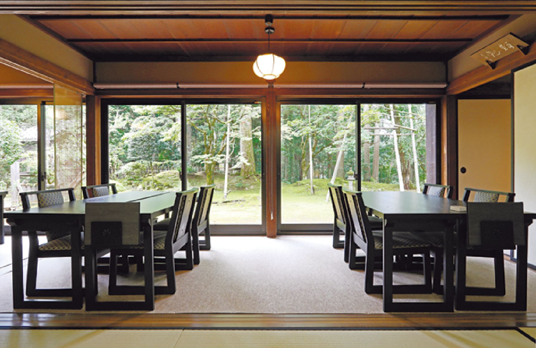 こけむした枯山水の庭園を眺める客席で食事をいただける。11月中旬には庭の紅葉が見頃を迎える