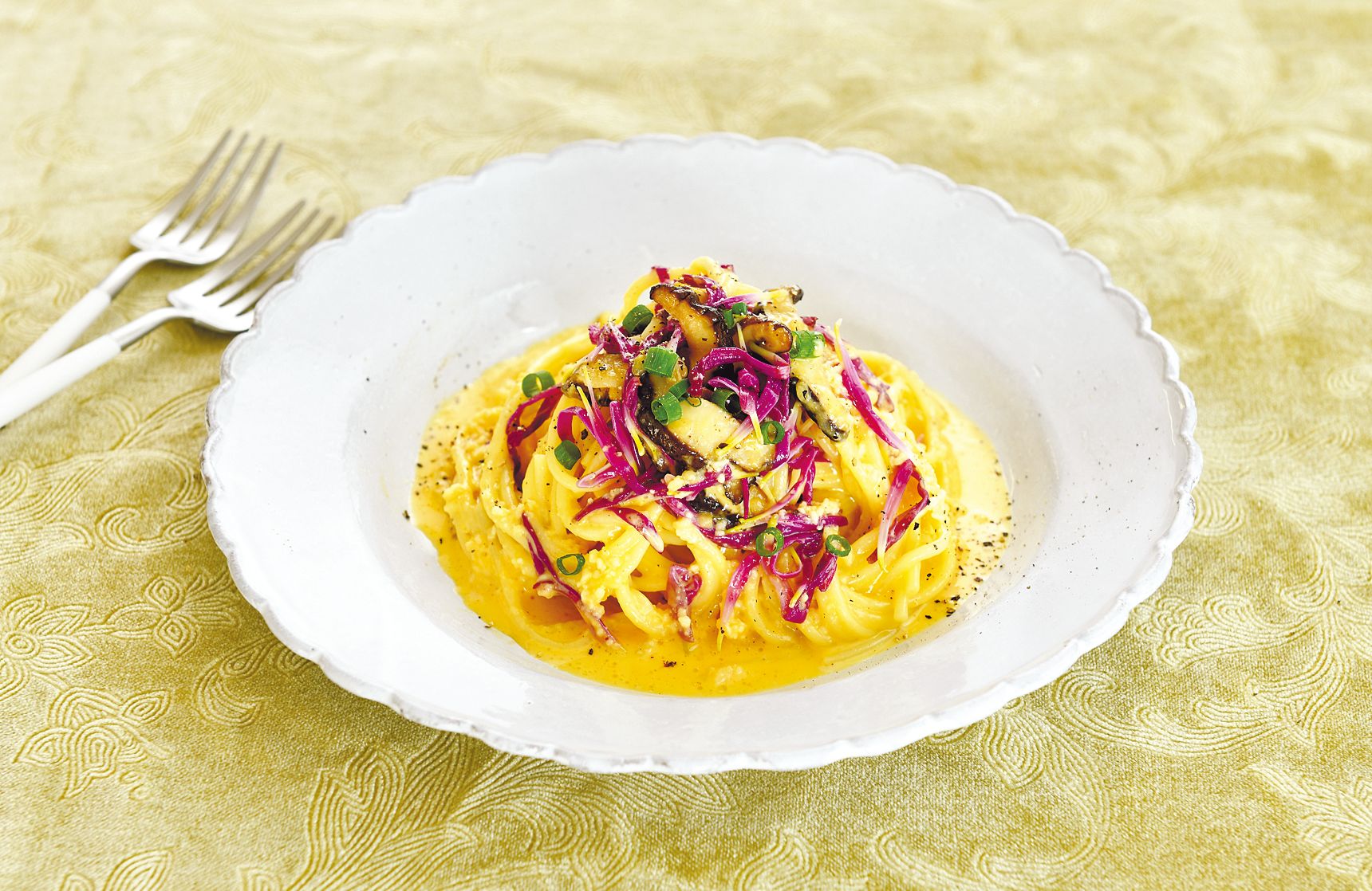 華やかな彩りのカキノモトをスパゲッティに。和食以外でも新たなおいしさの発見です。