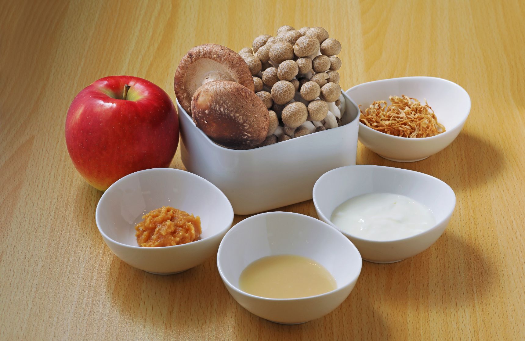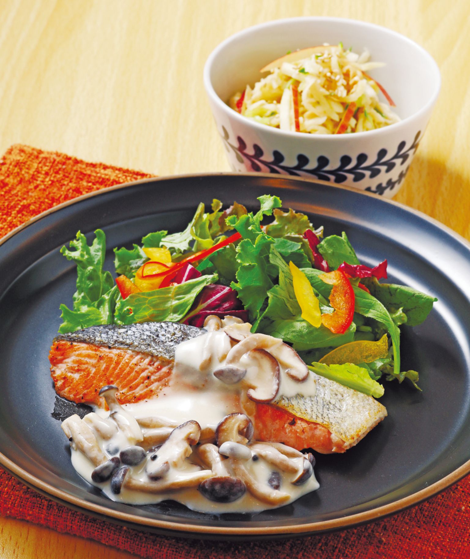 主菜はオメガ3系脂肪酸が取れる鮭に、食物繊維が豊富なキノコと発酵調味料をソースとした組み合わせ。副菜はたっぷりの食物繊維が取れる食材を塩こうじであえて。リンゴに含まれるオリゴ糖も善玉菌を増やす作用あり