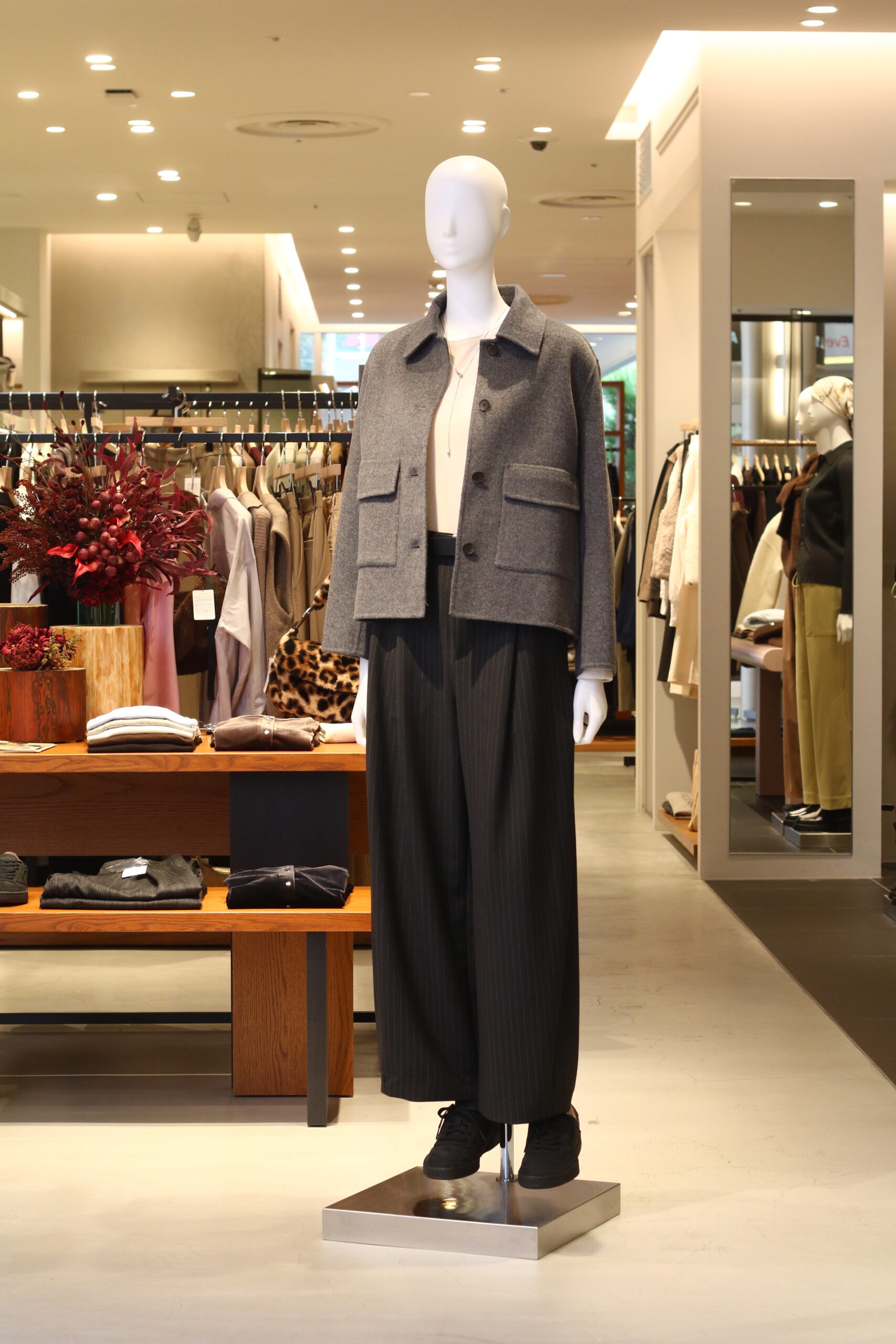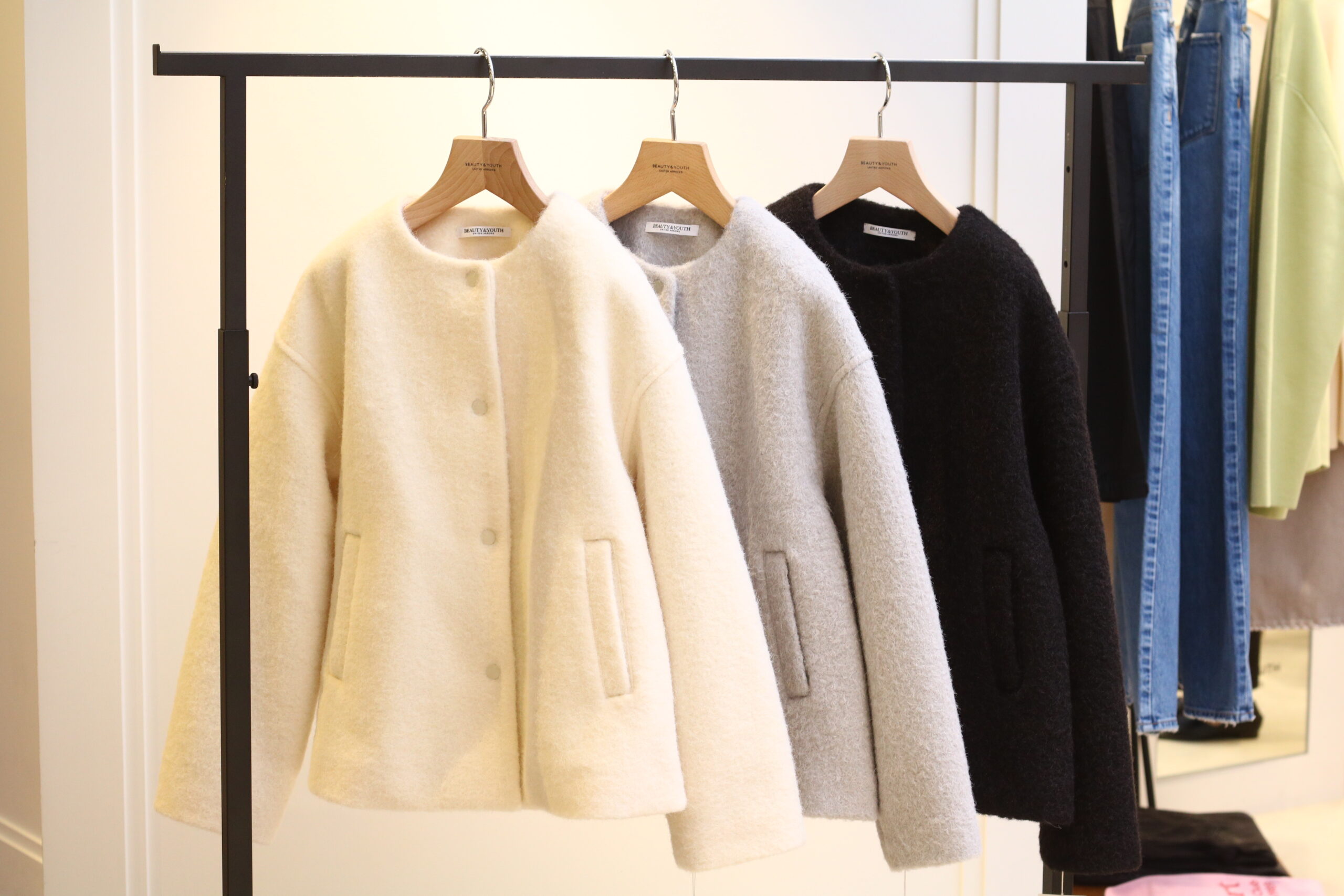 「豊かさ・上質感」をキーワードに、トレンドを取り入れつつ長く愛用できるベーシックなアイテムがそろうユナイテッドアローズ。今季お薦めのアウターをスタッフの難波彩紀さんに聞いた。「初冬からスタイリングに取り入れやすいショート丈に注目してください。ウールとナイロンを混紡した生地は暖かく、裏地のないリバー仕立ての柔らかくしなやかな着心地が特徴です。ワンピースやボリュームのあるボトムスと相性抜群です」。また、立体感のあるもこもことした質感のブークレー素材のブルゾンも手に取りたい。「カジュアルにもきれいめにも活躍する一着です。襟のないデザインなので、首元のレイヤードスタイルをお楽しみください」