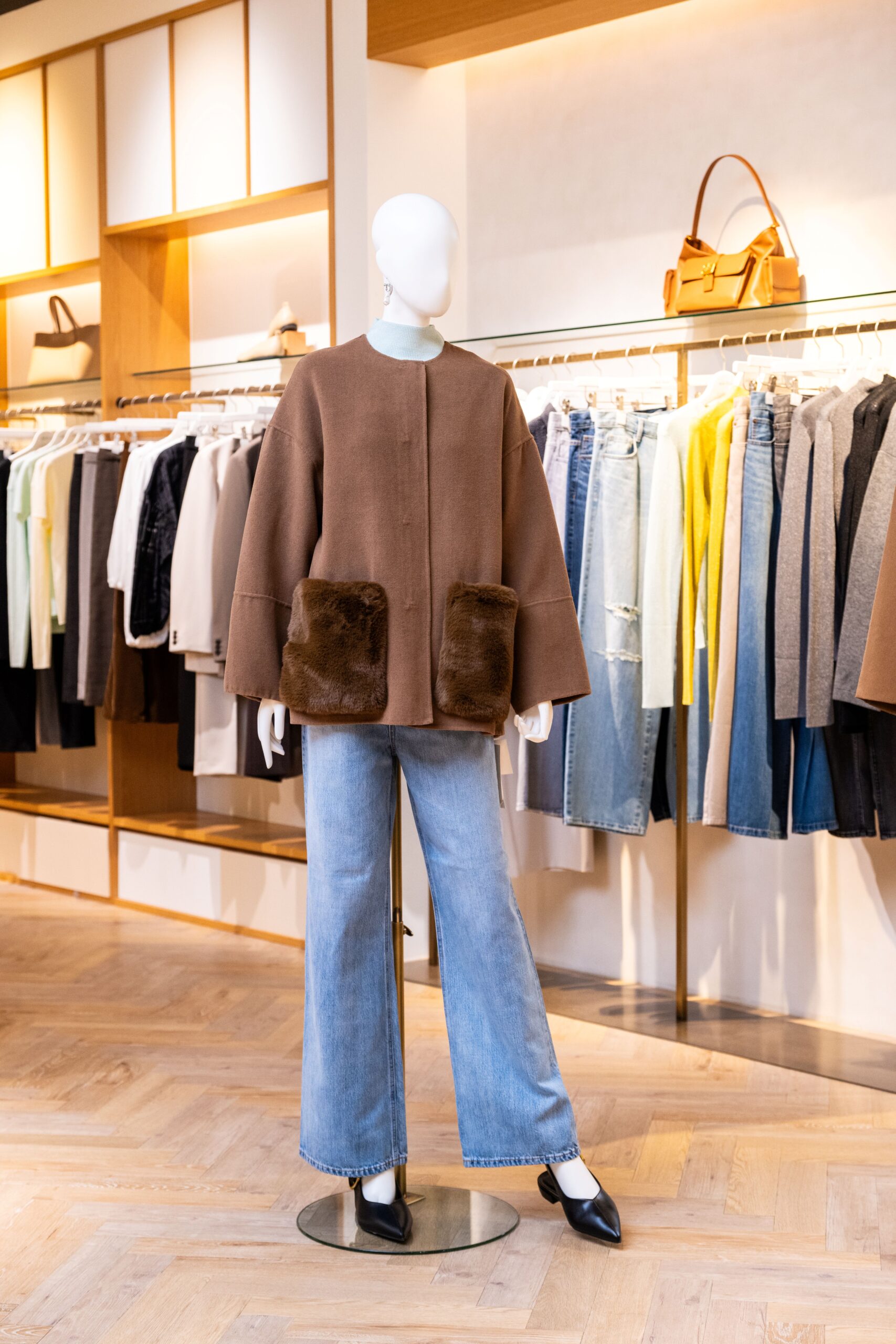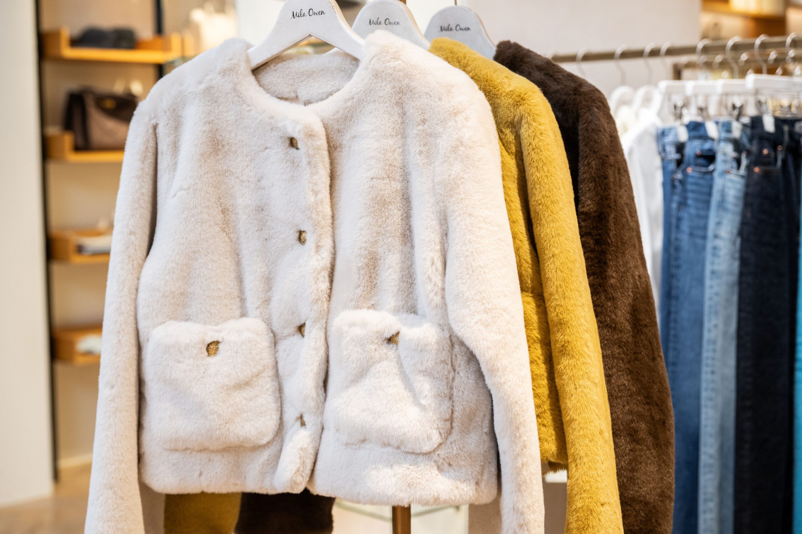 ミラ オーウェンは「ネクストベーシック」をコンセプトに掲げるブランド。店内には長く着続けられるアイテムが豊富に並んでいる。「寒い季節のコーディネートを女性らしく華やかに演出するアウターが豊富にそろっています」と店長の岩村芽生さん。「今季のお薦めは上品な雰囲気のノーカラーコートです。エコファーをあしらったポケットは取り外しが可能。シーンやコーディネートに合わせて異なる印象で着用できます」。また、ぬくもりを感じるふわふわとした手触りのファージャケットもチェックしたい。「品のあるファー素材と金ボタンが、きれいめなスタイルによく合います。カジュアルなデニムスタイルでも、女性らしさを引き出す一枚です」