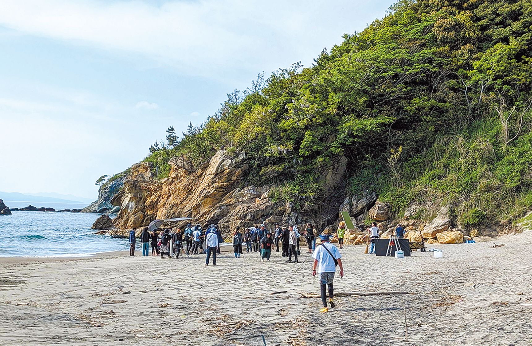 田ノ浦海岸での撮影の様子。大勢のスタッフが集まり、一つのシーンが撮影されたことが分かる