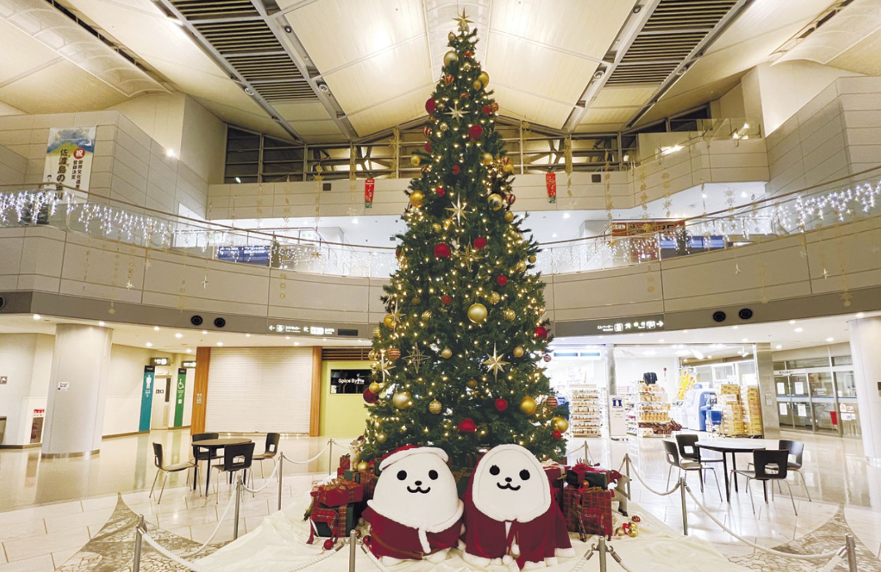 また、12月は1階ロビーにクリスマスツリーが登場。私も子どもを連れて、ツリーの前で写真を撮ったこともあります。空港のあちこちにいるキャラクターの米(まい)るくん、米(まい)ちゃんもかわいくて癒やされますよ。