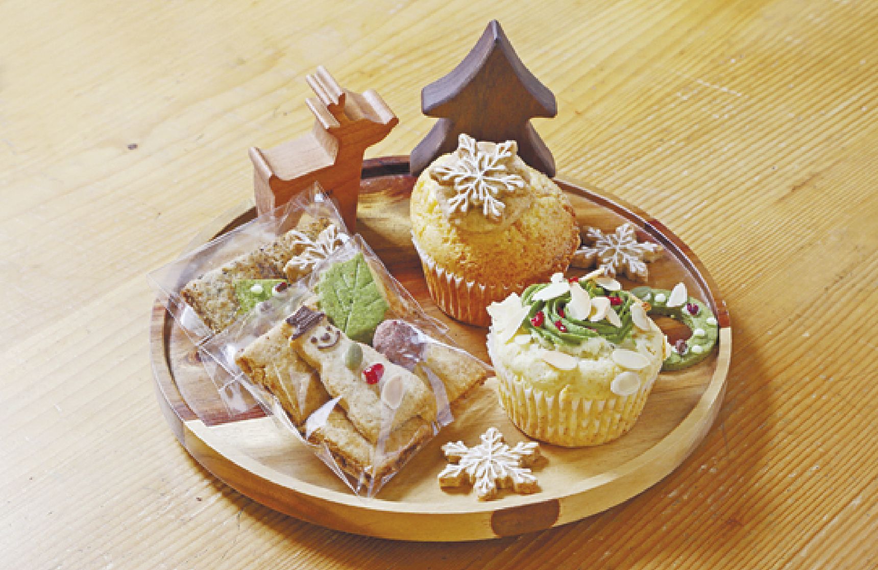 12月限定のクリスマスデコレーションのお菓子。マフィン300円~、クッキー180円~、シフォンケーキ230円