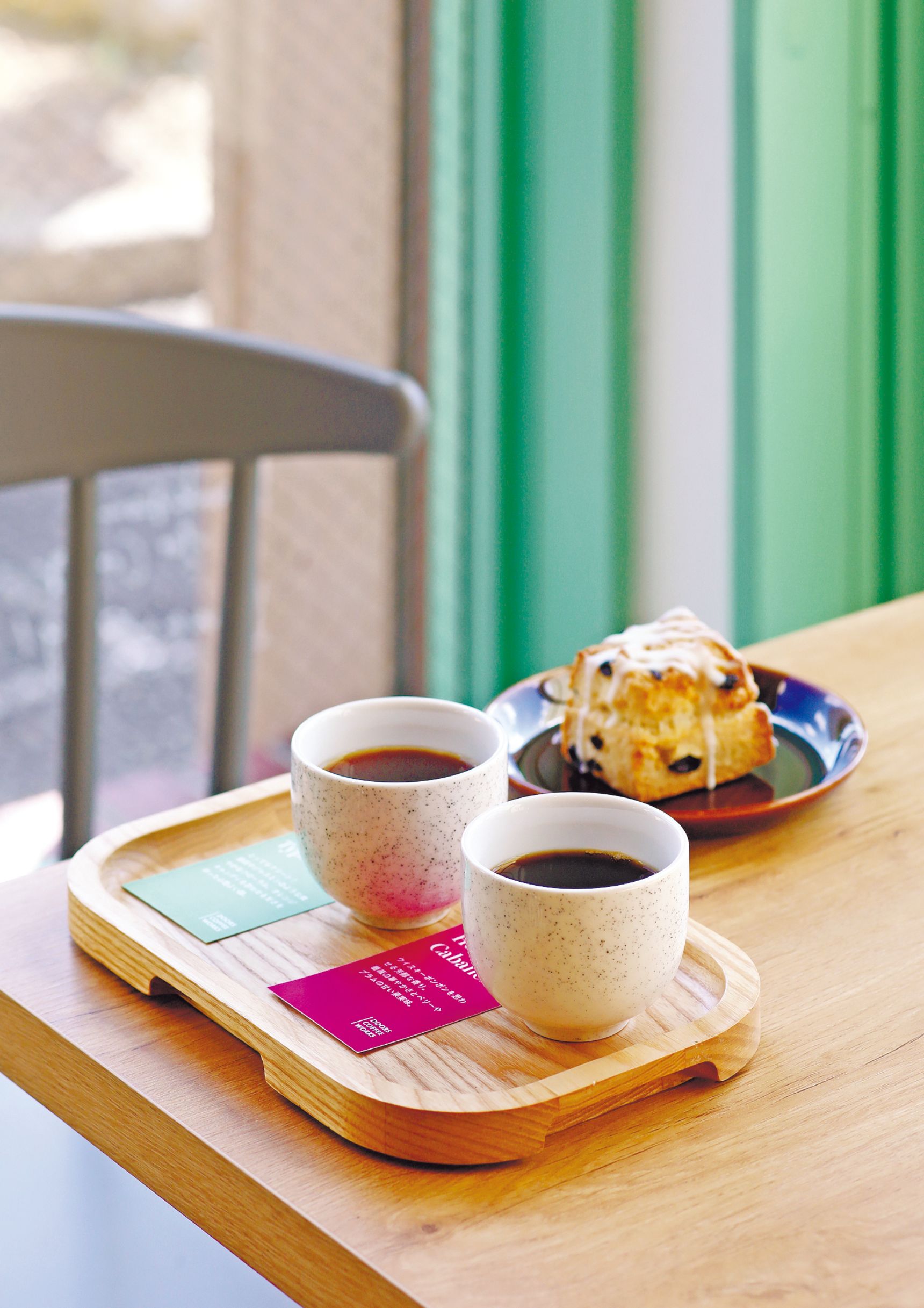好みの2銘柄を選べる「飲み比べセット」(1,300円~※銘柄により変動あり)、「レーズンとホワイトチョコのスコーン」(450円)。
