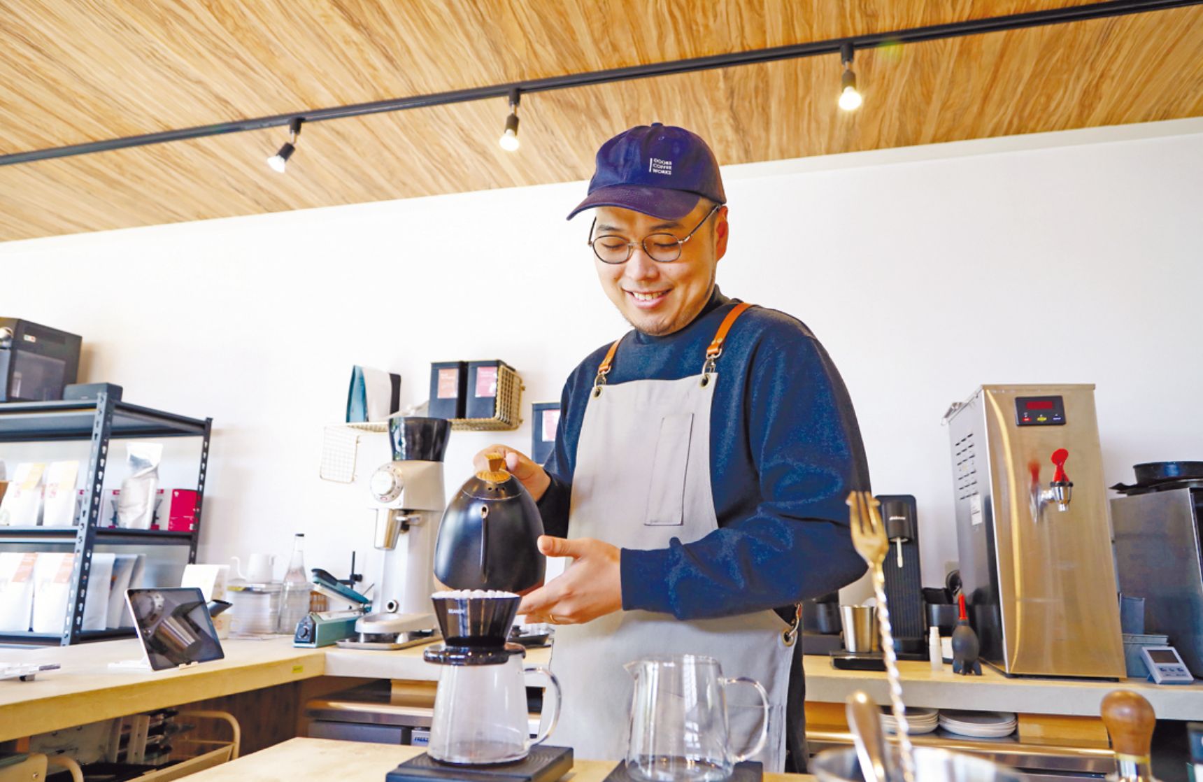 新潟市中央区京王の桜が丘公園の向かいにある、自家焙煎コーヒーを提供するDOORS COFFEE WORKS。店主の斉藤拓未さんはオーストラリア・メルボルンでの留学時にコーヒー文化に触れたことからバリスタの道を志し、宮城県のコーヒー会社で経験を積んだのち、2023年に店をオープンした。店名には「コーヒーに詳しくない人も気軽に立ち寄ってもらって、コーヒーの世界への入り口になれたら」との思いが込められている。