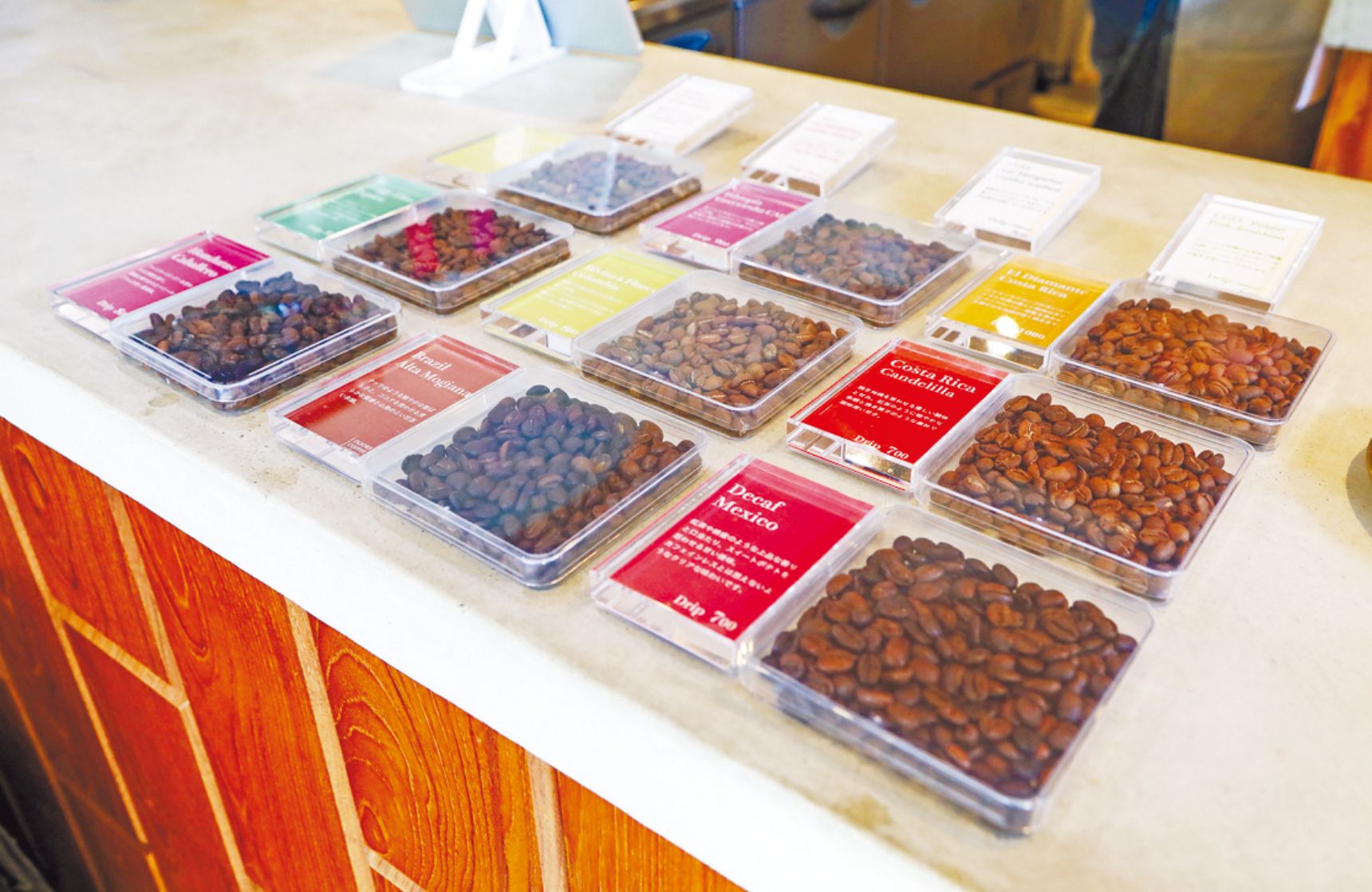 バニラなどの香りを浸透させるインフューズドコーヒーなど、バラエティーに富んだ豆が並ぶ。豆はオンラインで通年販売