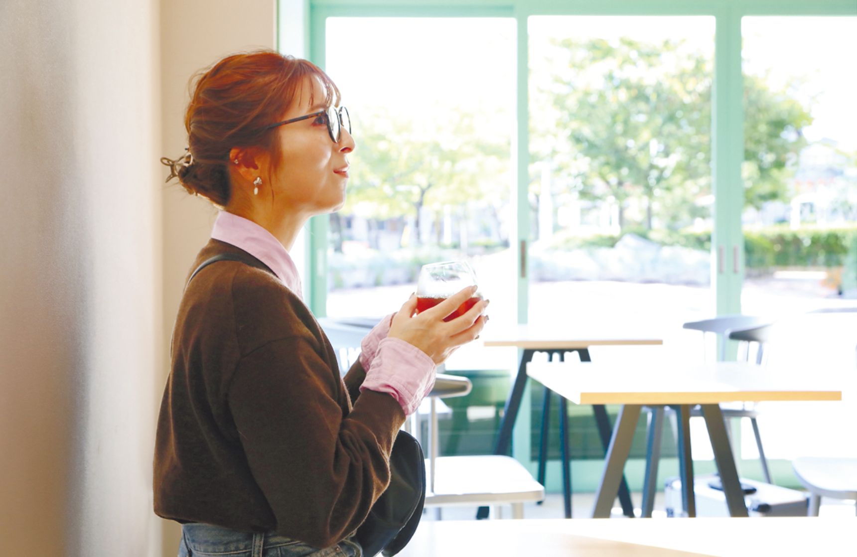 窓の向こうに公園の風景が広がる、開放感ある店内