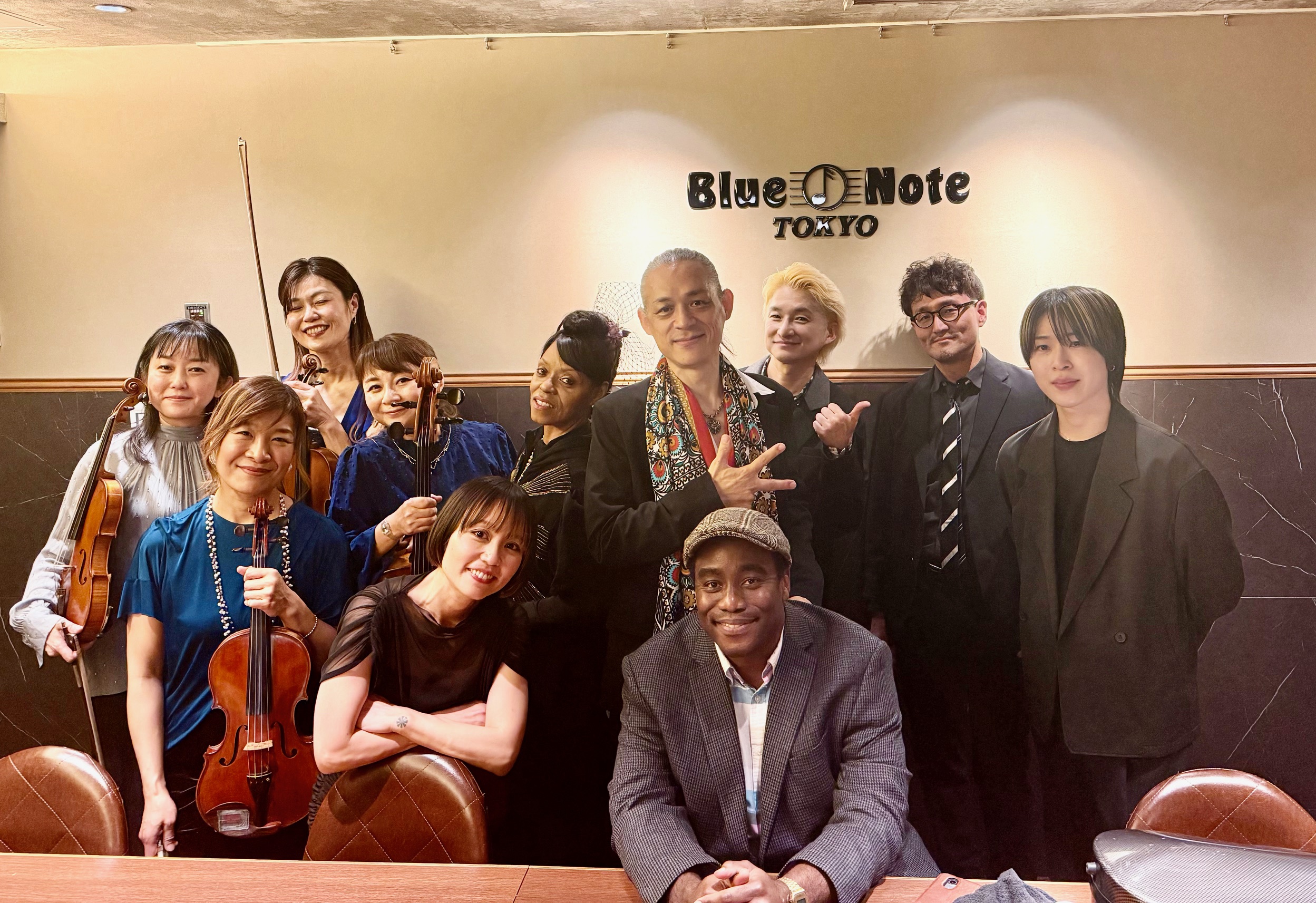 12/2 のブルーノート東京・追加公演の終演後。左から4人がチドリ・カルテット、ゲストの多和田えみ(vo)、エンディア・ダベンポート(vo)、僕、デビッド・ブライアント(p)、ゲストのNAOTOくん(vln)、安田幸司(b)、山崎隼(ds)