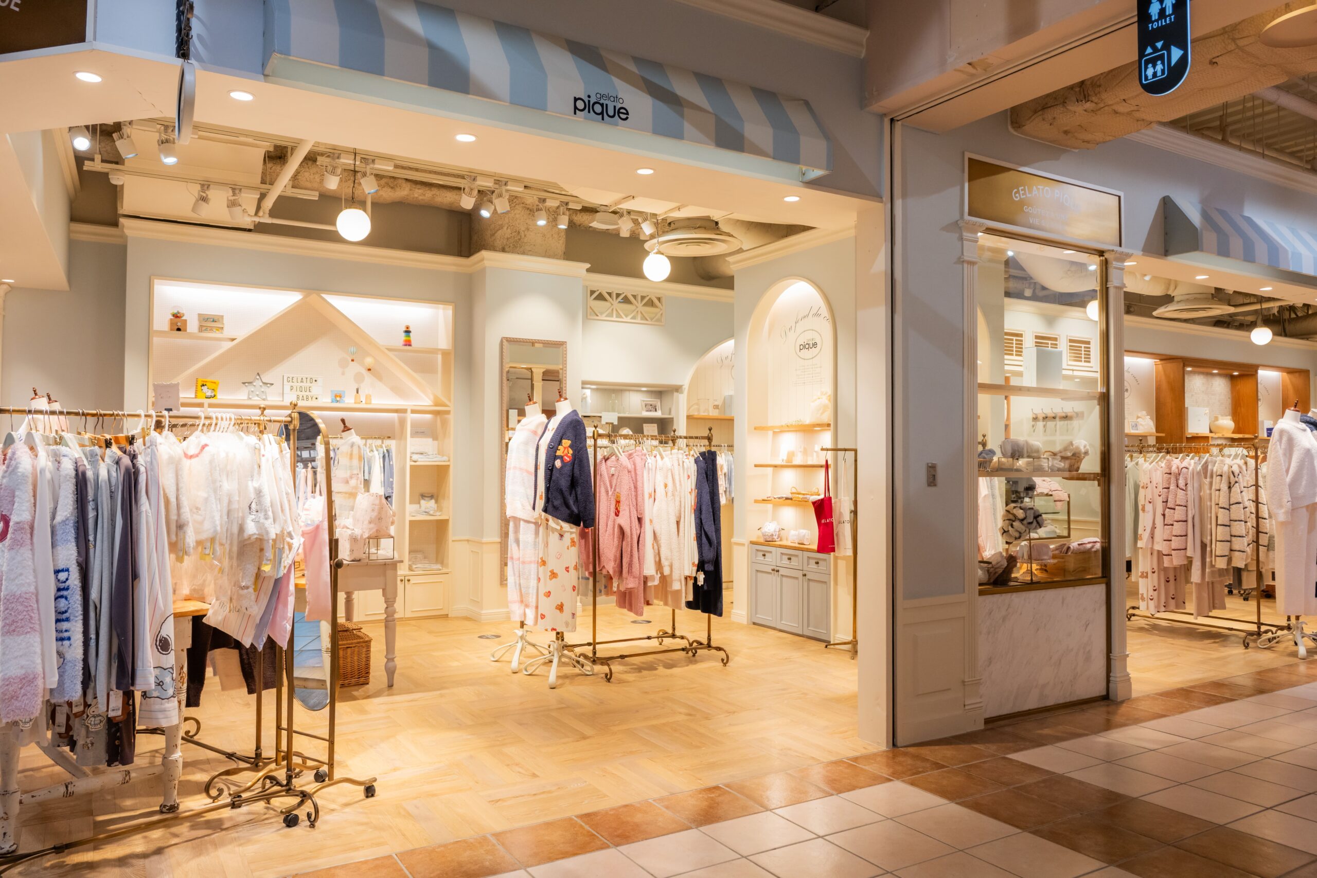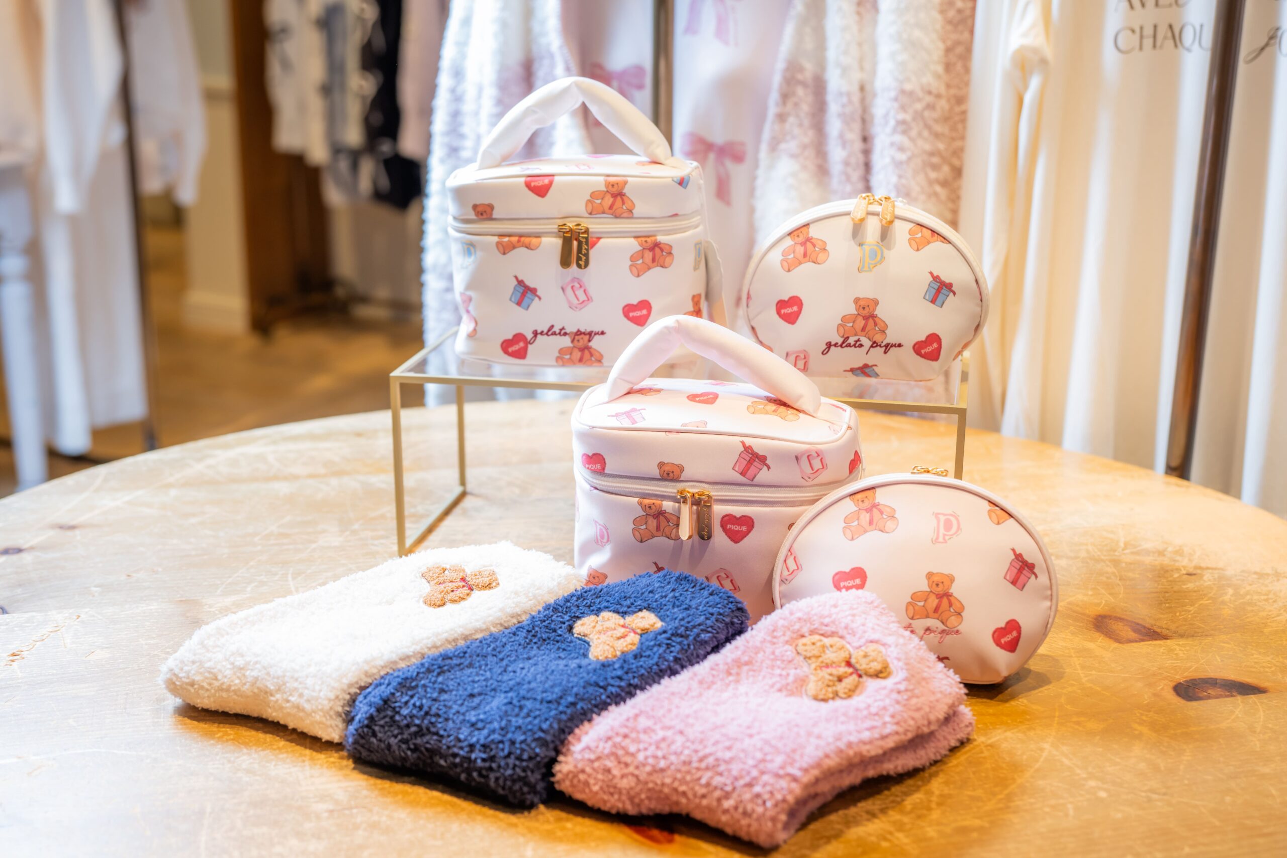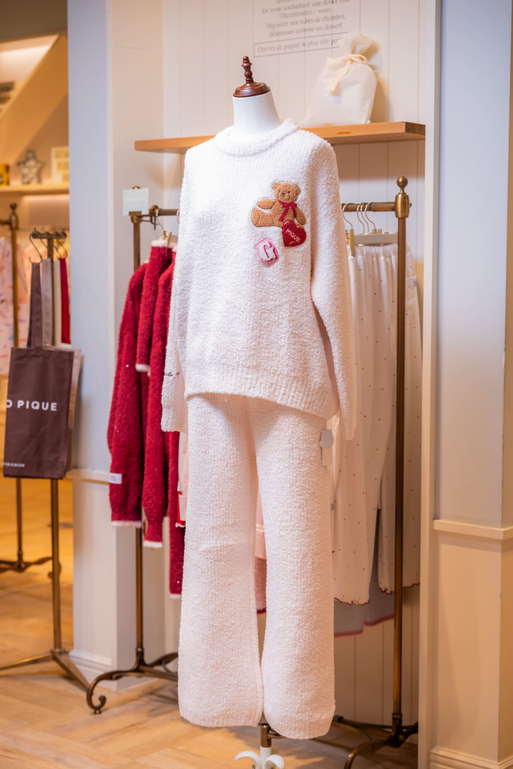 「大人のデザート」をコンセプトに掲げるジェラートピケ。ふわふわとした柔らかい肌触りの素材を使ったルームウェアが人気だ。店長の塚田里織さんに聞いた。「ブランドを代表する生地、BABY MOCO (ベビモコ) を使ったシリーズに注目してください。暖かさと軽やかさを兼ね備えた着心地の良さが特長です」。お薦めのルームウェアは、胸元に熊のぬいぐるみとハートのクッションなどの刺しゅうが入ったデザイン。ゆったりとした身幅と、やや短めの丈感のシルエットがポイントだ。「アイボリー、ピンク、ネイビーの3色展開。同シリーズのショートパンツやロングパンツとセットアップで着こなしてください。ルームソックスやポーチも展開しています」
