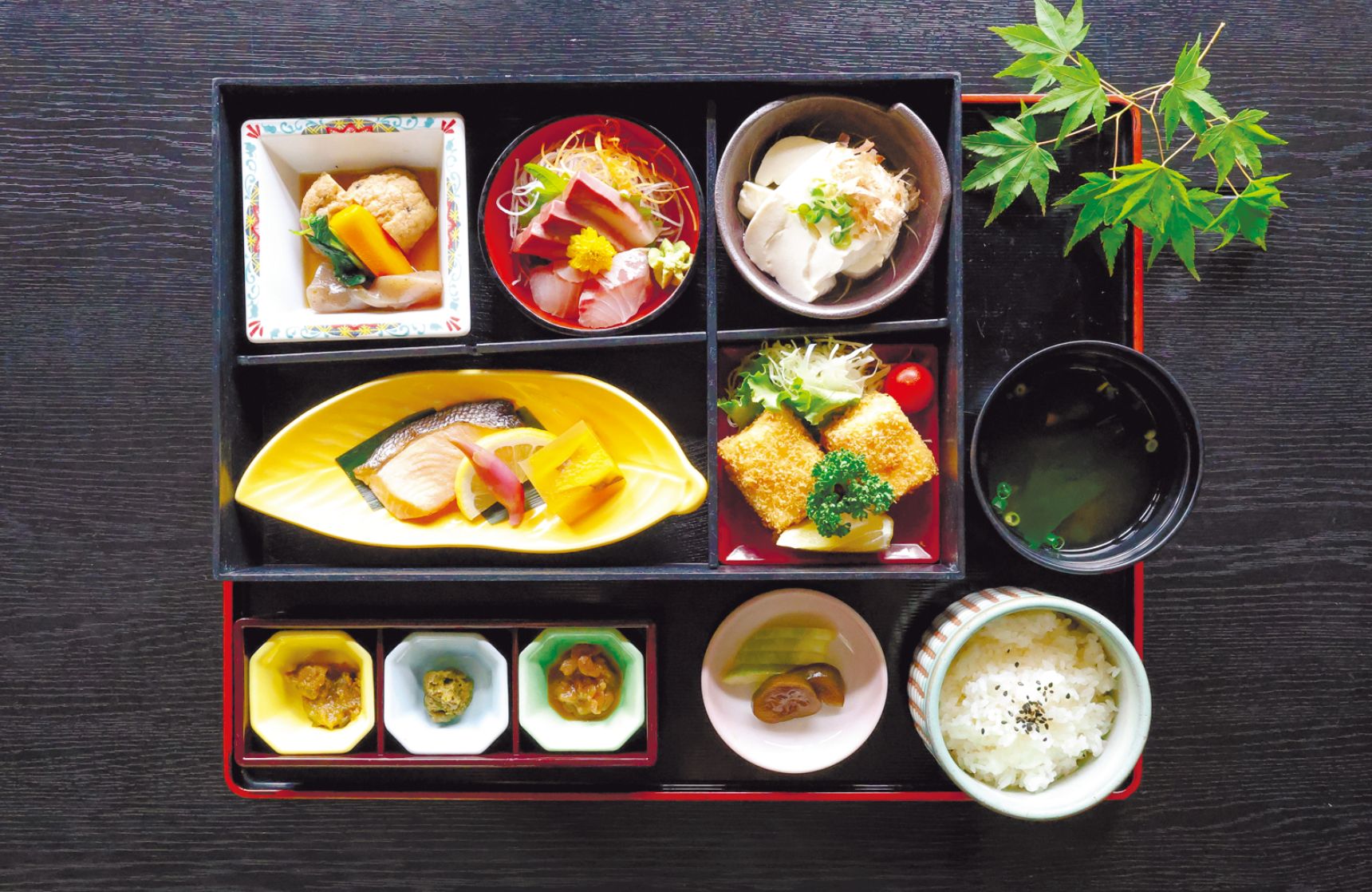 「お食事処やまどり」で味わう里山の恵みを詰め込んだ「じょんのび御膳」(1,580円)。高柳産コシヒカリのごはん、自家製豆腐、地元の名物が味わえる