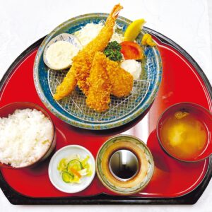 1日20食限定「シーフードミックス満腹定食」(1,150円)はホタテ、エビ、イカ、カラスカレイのフライがセットに。ごはんは地元のコシヒカリを使用