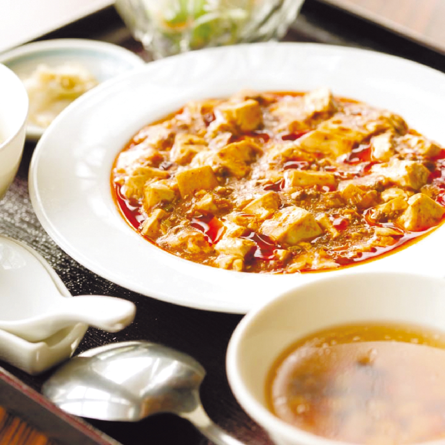 「陳麻婆豆腐セット」(1,200円)。ごはん、スープ、漬物付き。爽やかな辛みとうまみ、しびれがクセになる