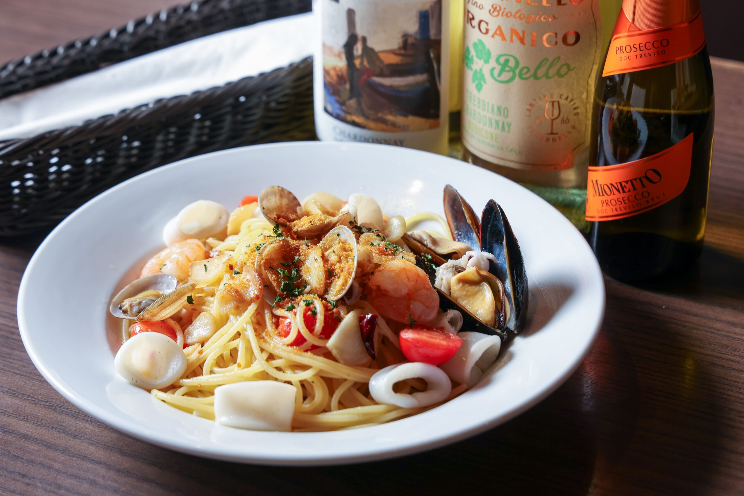 南イタリアのトラットリアをテーマに本場の味を提供するカプリチョーザ。素材の良さを生かした見た目も華やかなパスタを提供している。「お薦めは魚介のうま味とカラスミのコクが加わった風味豊かな『イタリア産カラスミと魚介のペペロンチーノ』です」と店長の倉島美希さん。イカやエビ、アサリ、ムール貝などがたっぷり入ったぜいたくな一皿で、ディナータイムにはアルコールドリンクと一緒に味わいたい。白ワインとの相性が抜群だ。また、創業当時から人気の『カプリチョーザアイス』は食後のデザートにぴったり。「濃厚なバニラアイスに熱々の自家製ブルーベリーソースをたっぷりとかけた当店の定番デザートです。温かく酸味のあるブルーベリーソースと冷たいアイスのコントラストをお楽しみください」