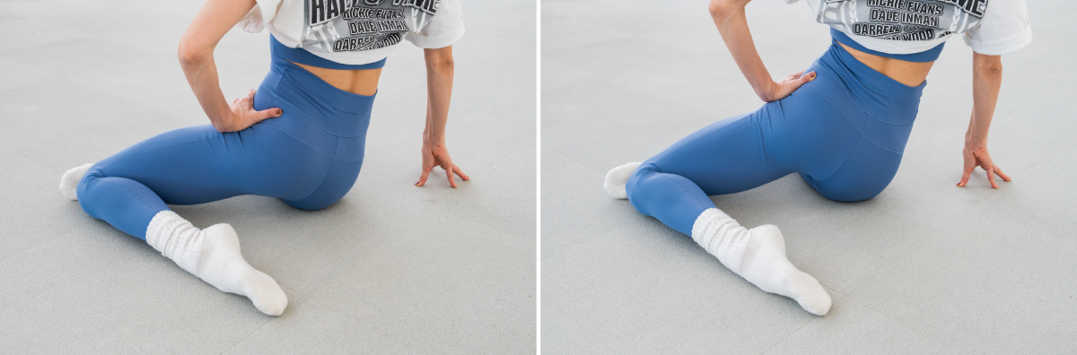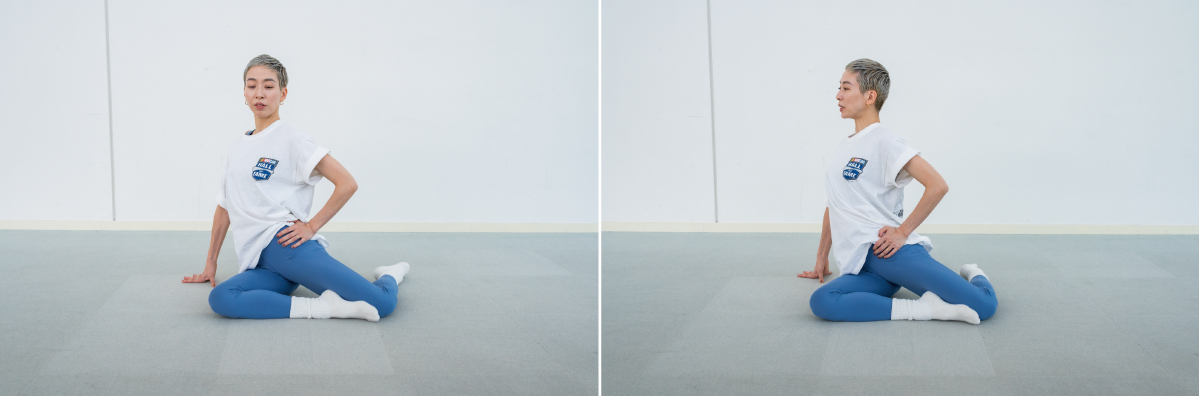 2:左足の付け根を立て、右の股関節に乗るように体重を移動します。左の付け根を伸ばすというより、右の股関節を深く折り畳んでいくイメージで。その後、元の位置に戻ります。