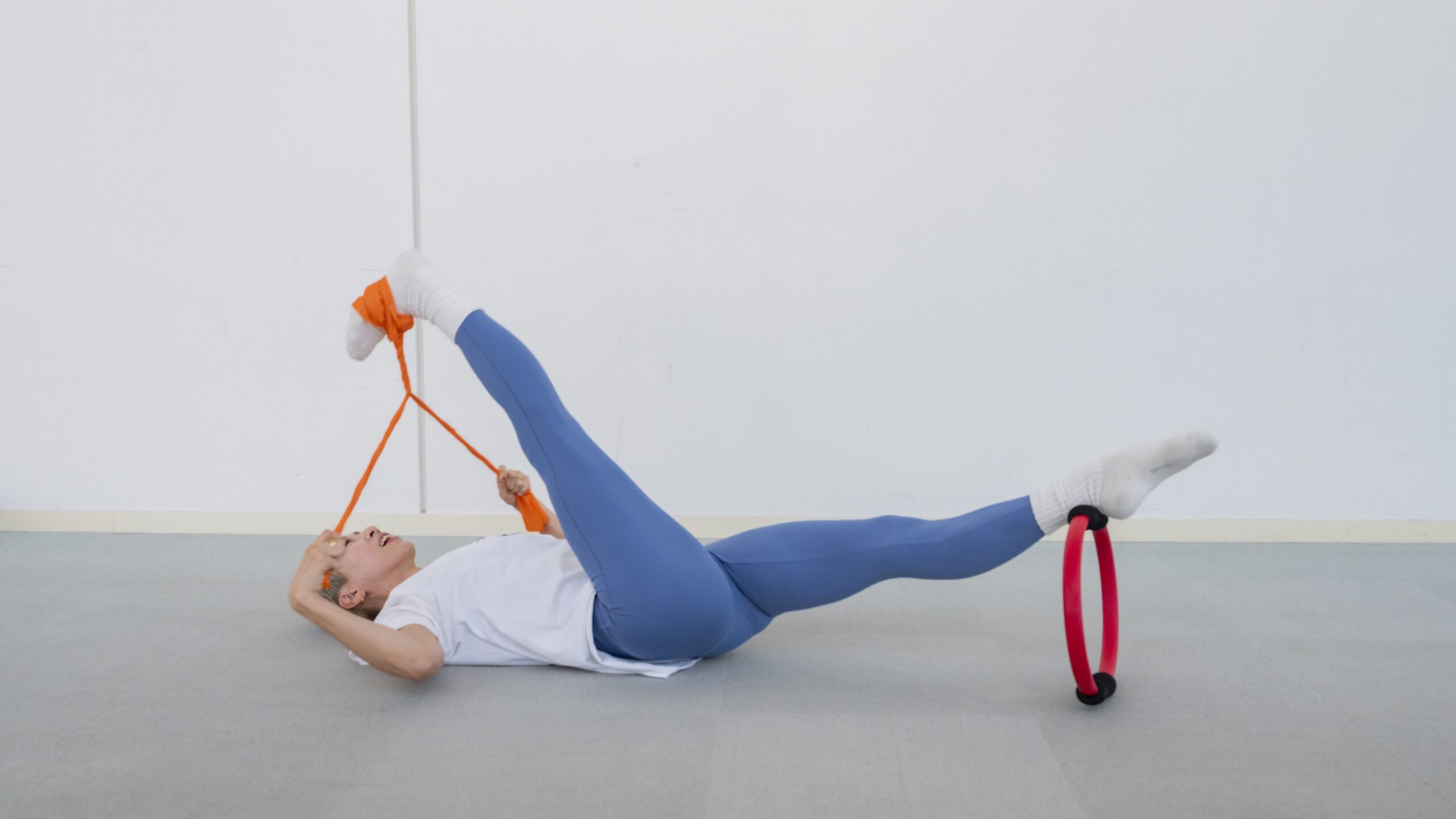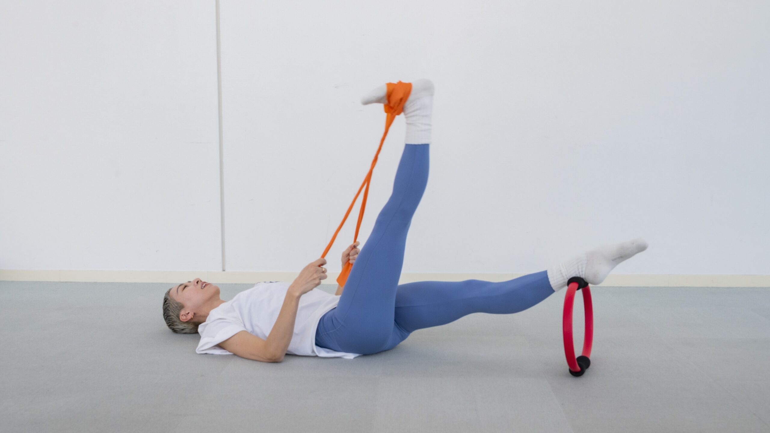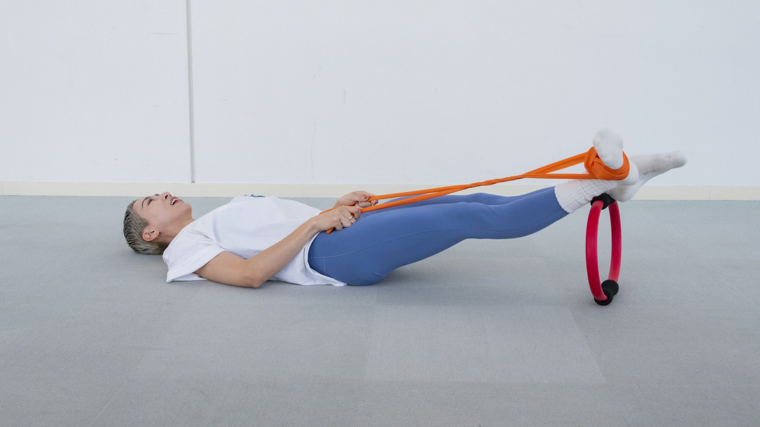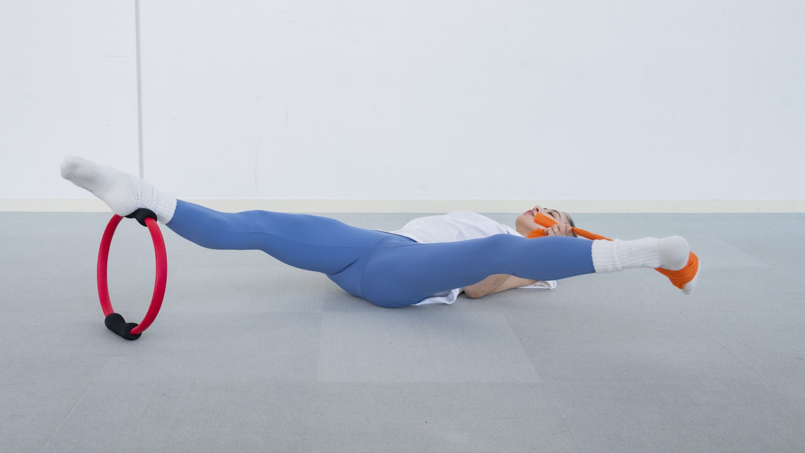 リングに乗せた足は下方向に押しながら行いましょう。ハムストリングを伸ばし続けるように意識すること。