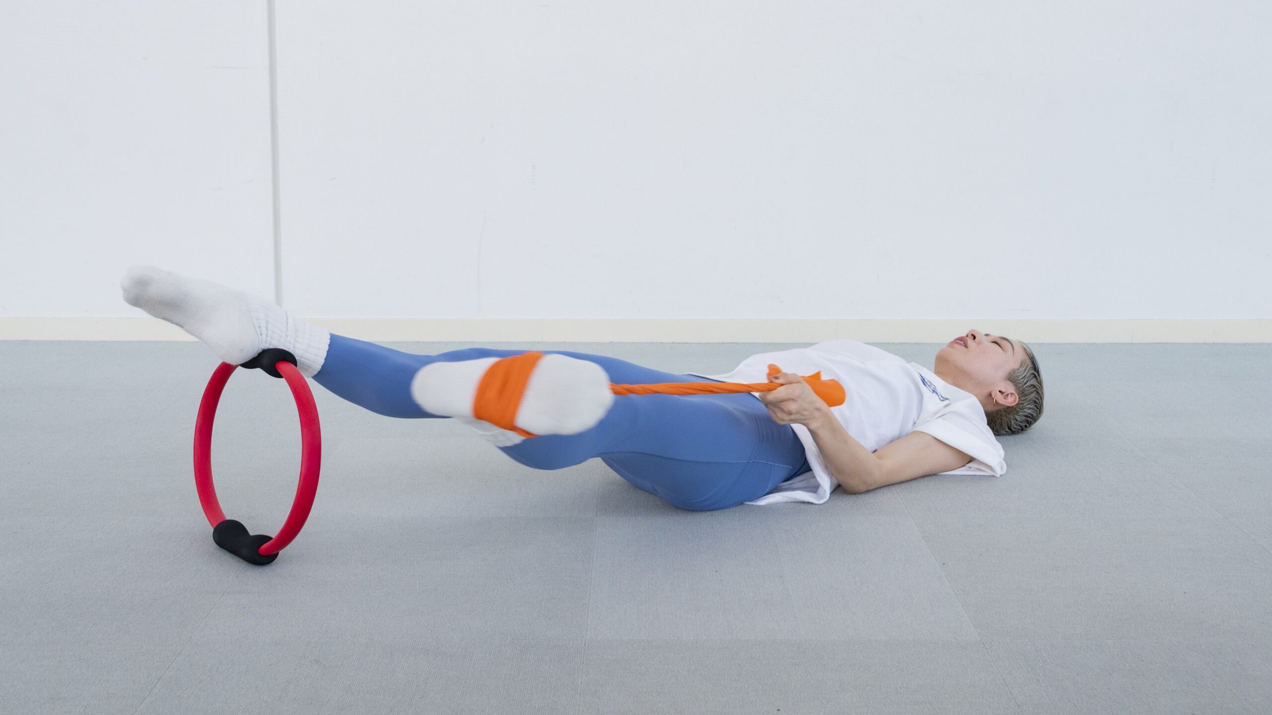 「この動きをしておけば、一日中動ける」と井関さんが言う上級者向けのストレッチです。足に巻くのはタオルでもいいですが、伸縮性のあるゴム製の「セラバンド」を使うと、可動域が広がり、効果も高まります。