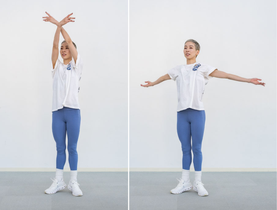 2:右手を右、上、左、下へと回す。顔も手と一緒に動かし、上半身はひねるように。無理に止まらず、動き続けましょう。