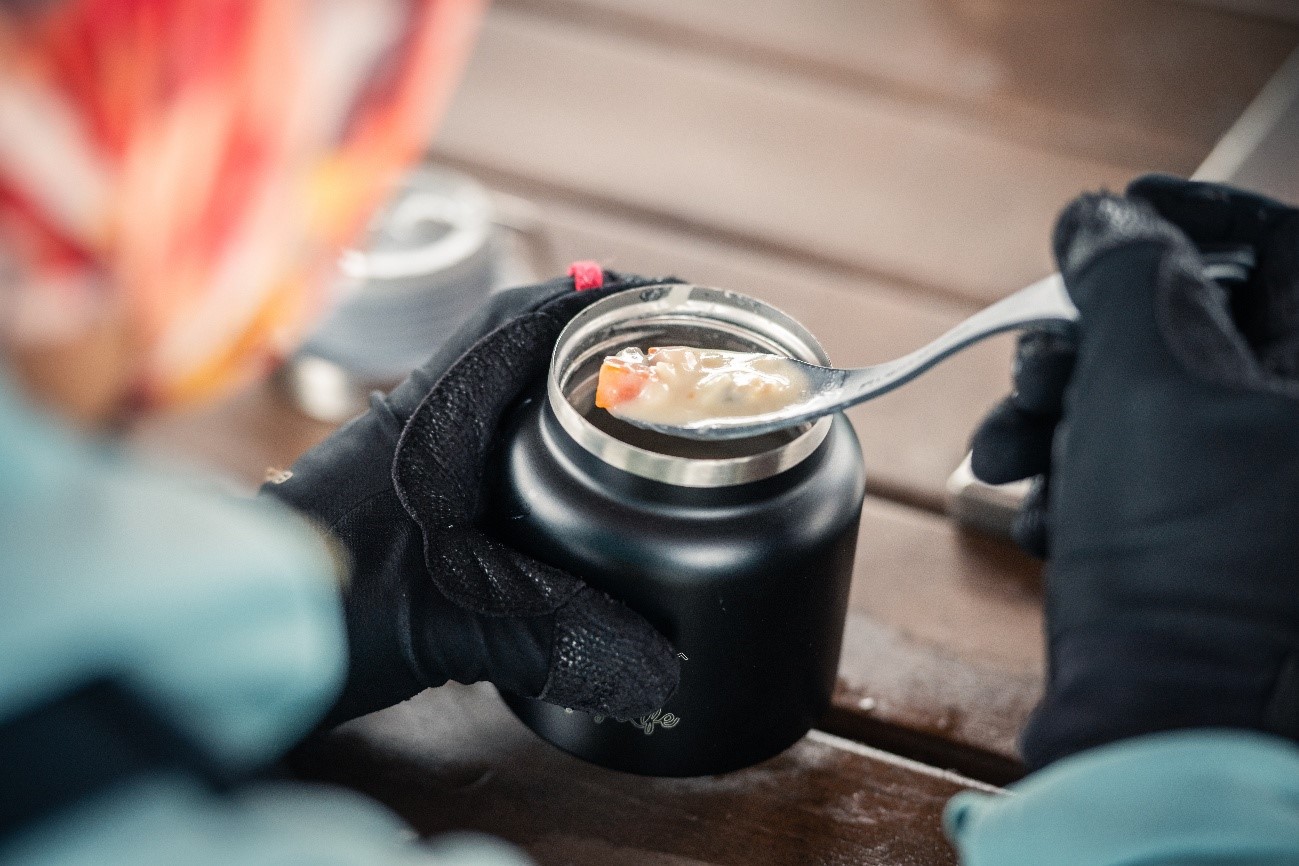 フードジャーで温かい食事を楽しむのも雪上ピクニック感が高まります