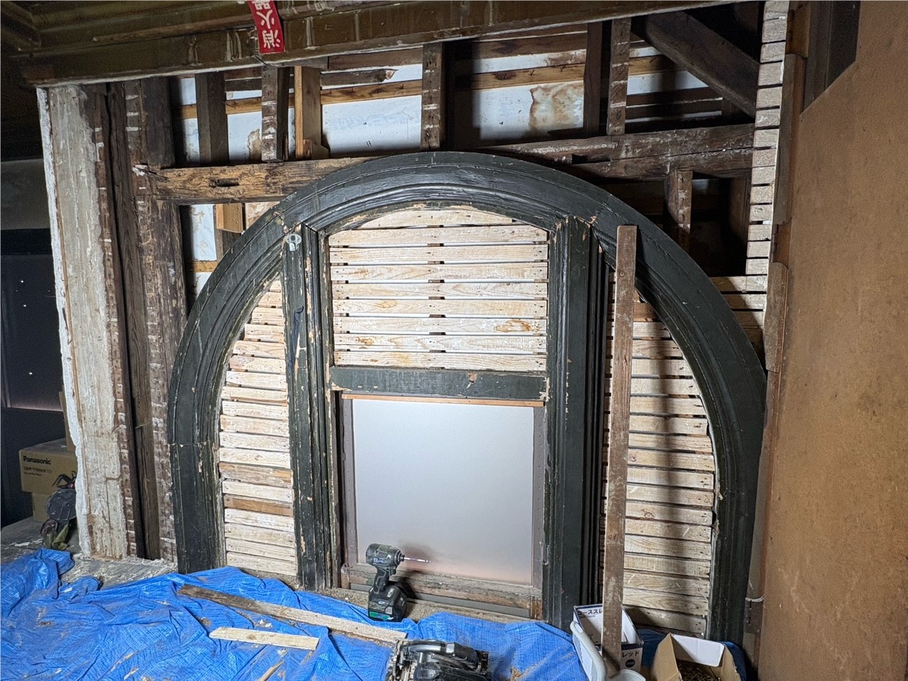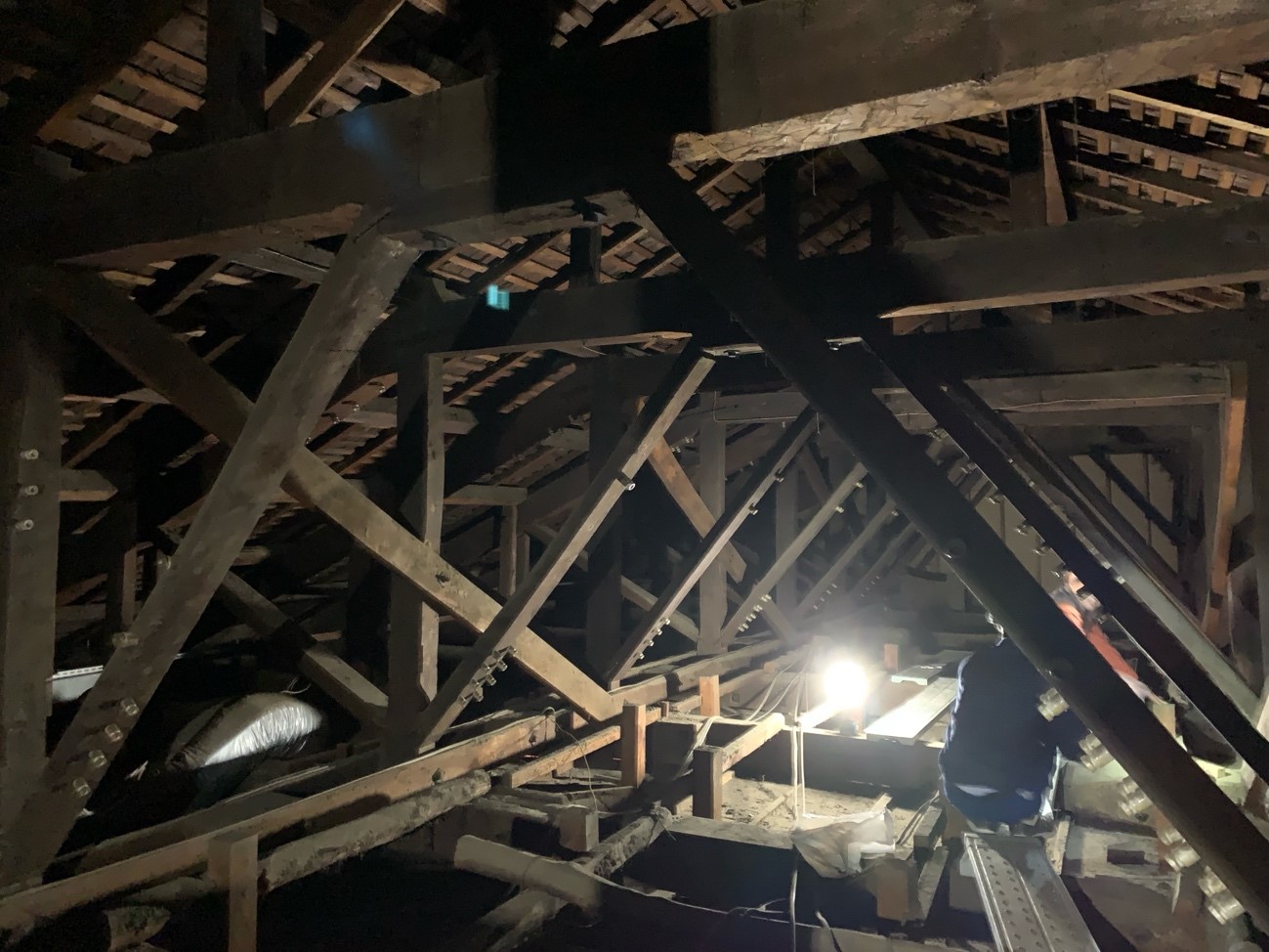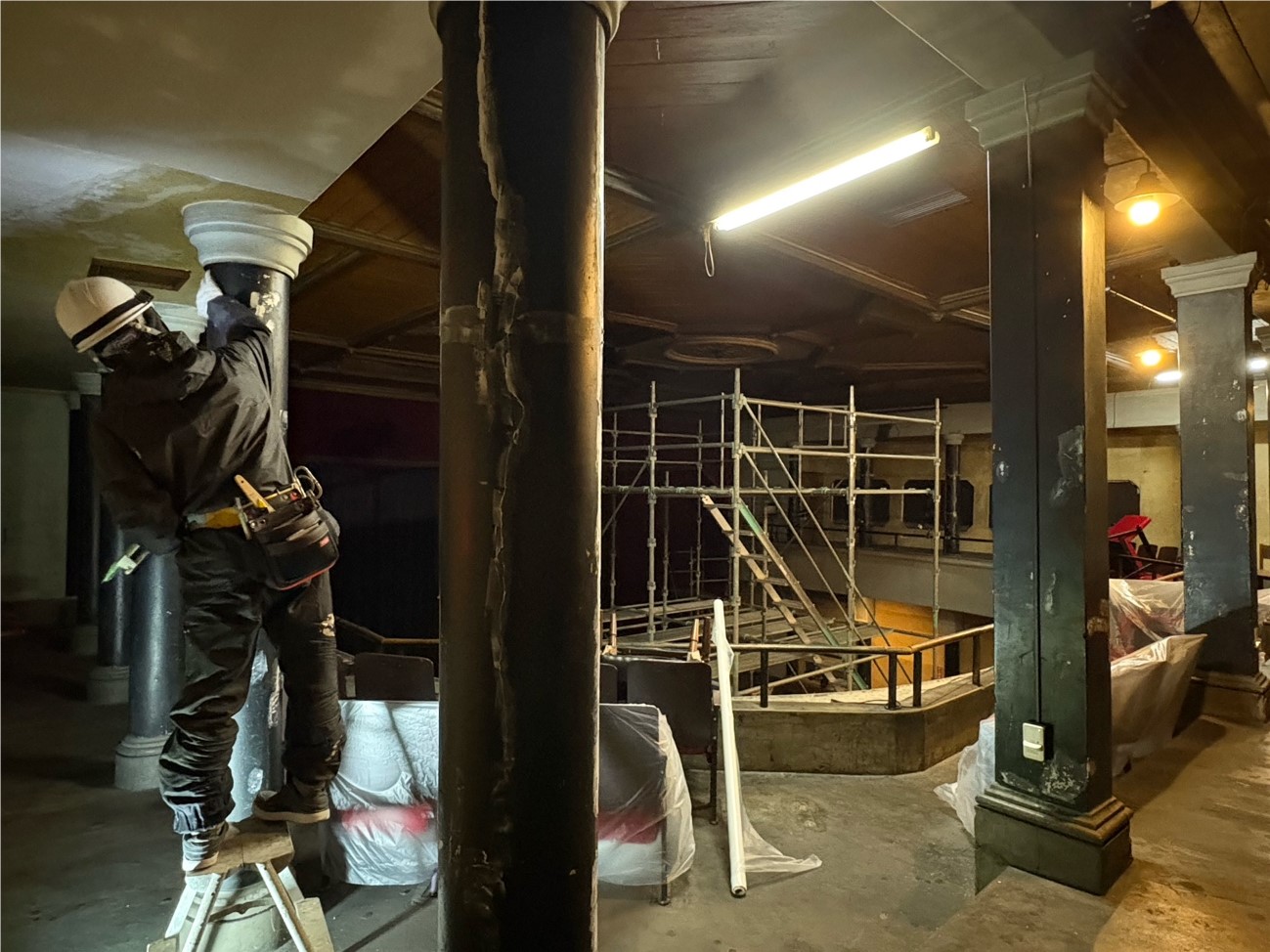その中でも修繕プロジェクトの目玉であるのが天井装飾の工事となります。写真にあるように大きな足場を場内に組んで、115年前の開館以来、一度も手を加えられることのなかったこの装飾について修繕を施す機会となります。意匠には全く変更を加えることはないのですが、内部からしっかりと支える補強を行い、今後も維持していけるような措置を施します。このほかにも、(ところどころ部分的に改装が行われている館内にあって)明治期の建造以来そのままの古い部分も修繕の対象となっています。面白いのは、なるべく当時の資材をそのまま使うということで、例えば崩落しかかっていた壁面に使われていた木材は一旦外した上で、また組み直して再利用される点です。そのあたり高田世界館が文化財ということで相応の配慮がなされています。