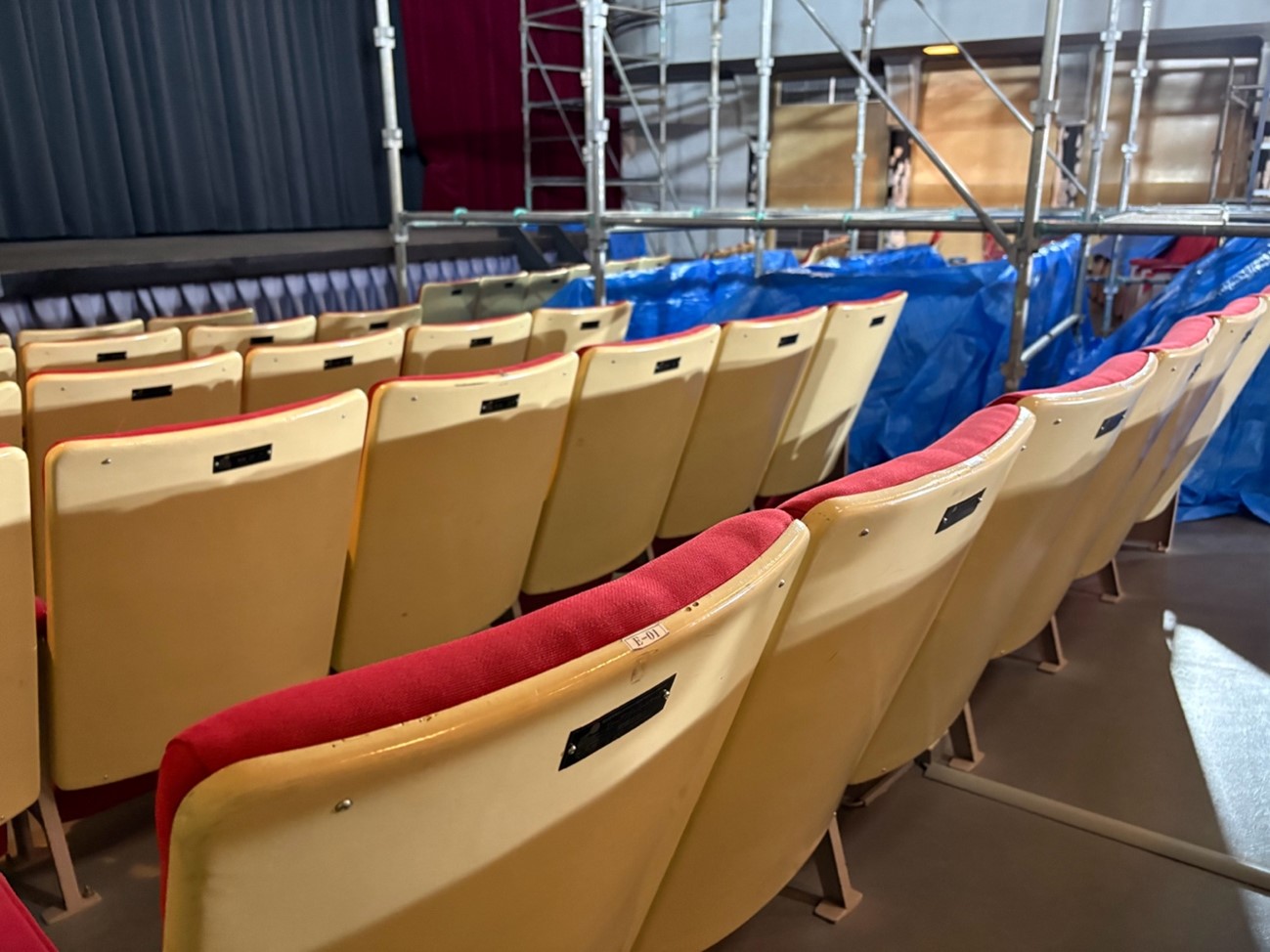 工事の合間に、静まり返った場内のシートに座ってみると、目の前の黒いプレートが目に留まりました。それは15年以上前、椅子のリニューアル工事を行った際に広く寄付を募った時のもので、プレートには寄付者の名前が刻まれています。座席数も多く、全容を把握できていないままになっていたのですが、たまたま目にしたそのプレートには今でもお世話になっている、地域の見知った方々のお名前が入っていました。