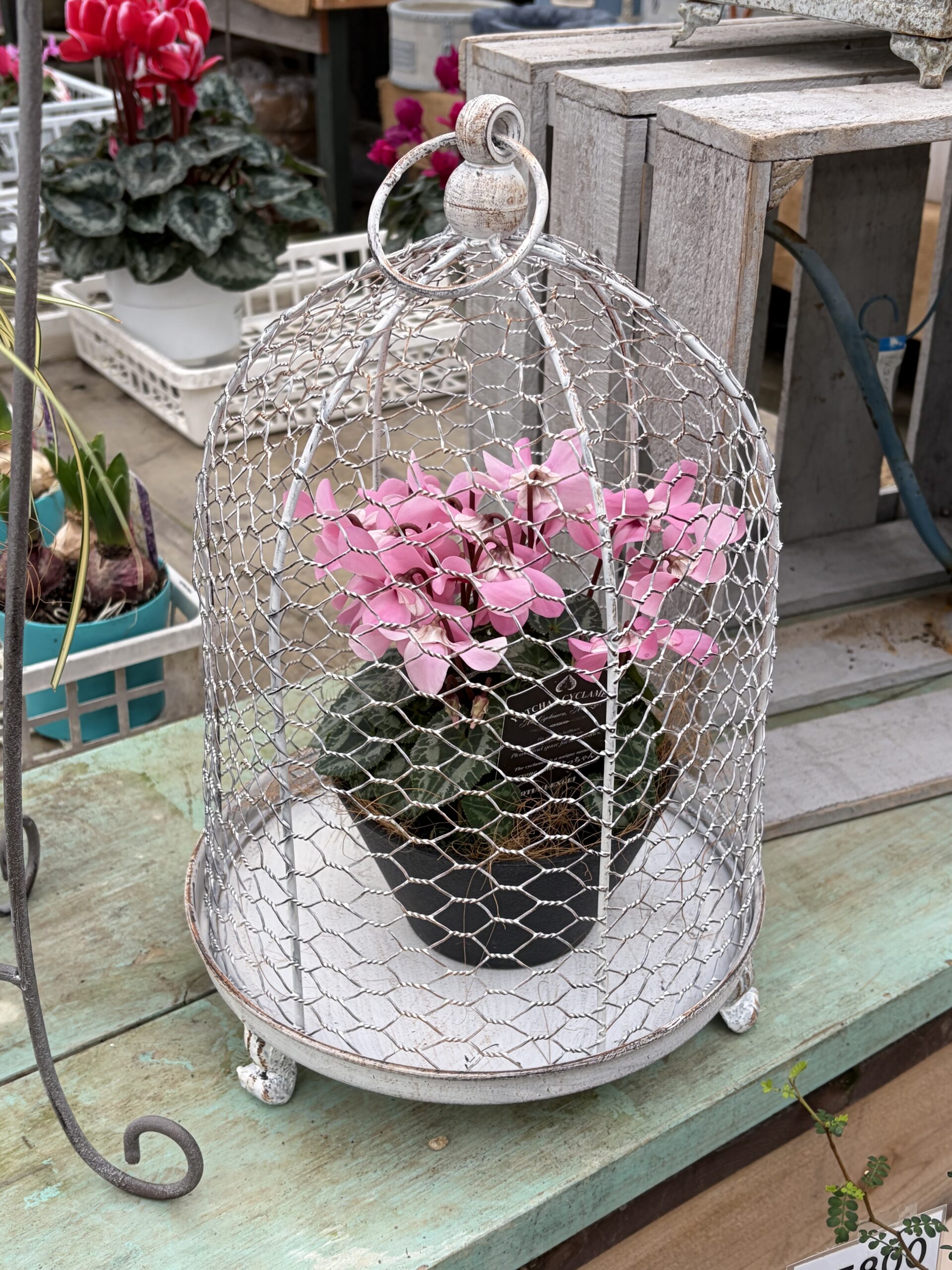ピンクのシクラメンと、アイアンのシックな色がおしゃれ感をアップさせてくれるので、一鉢だけでも華やかに見えますよ。