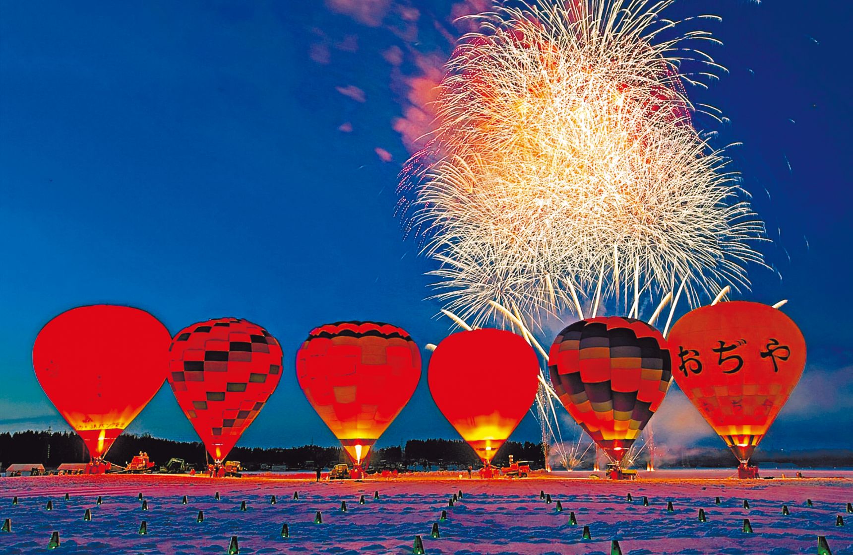 夜の雪原を巨大な熱気球と花火が彩る「グローバルーンフェスティバル」。ことしはランタンのあかりも華やぎを添える