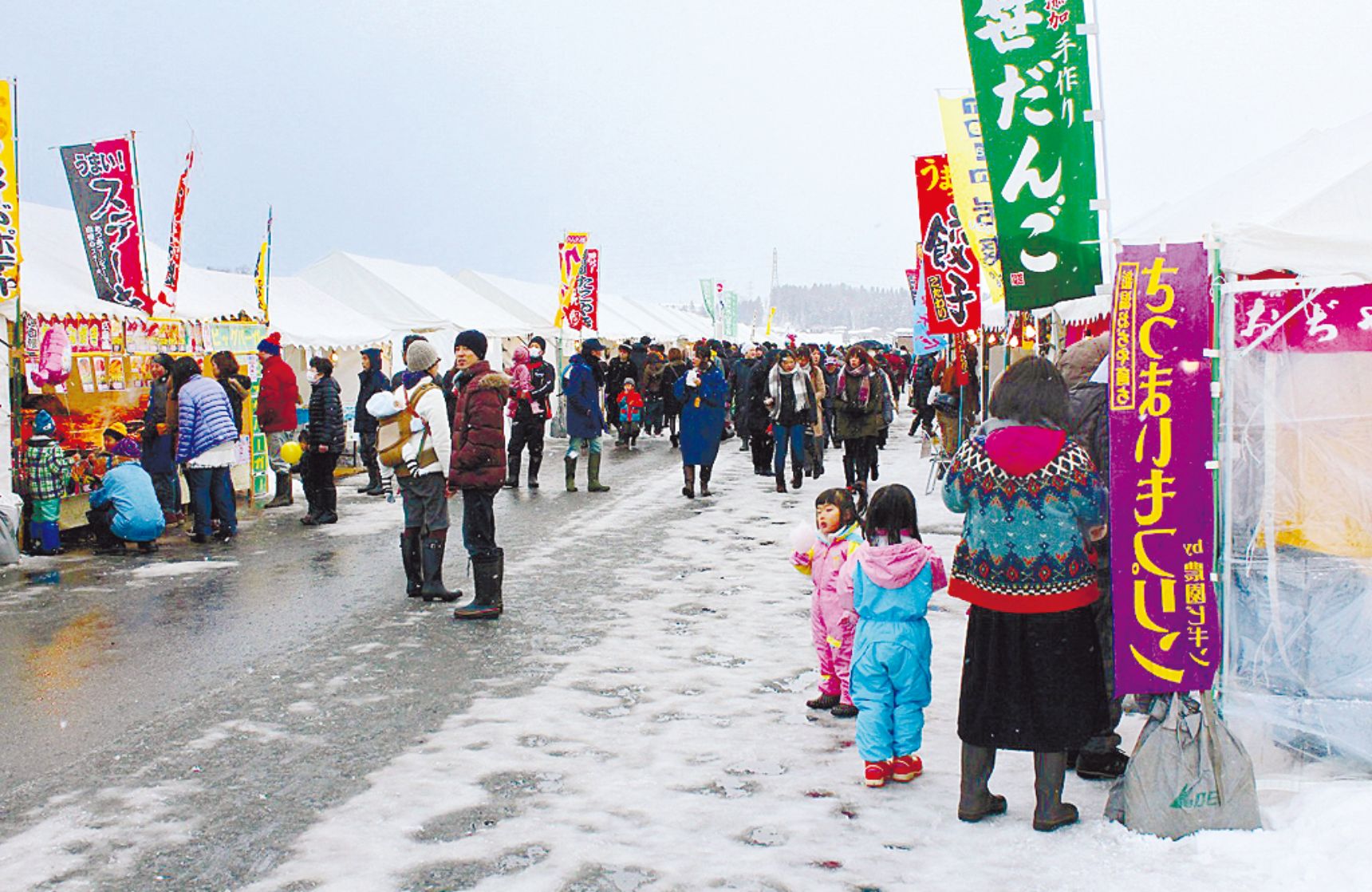 雪原イベントで盛り上がる平沢会場。うまいもの広場で小千谷名物を味わおう