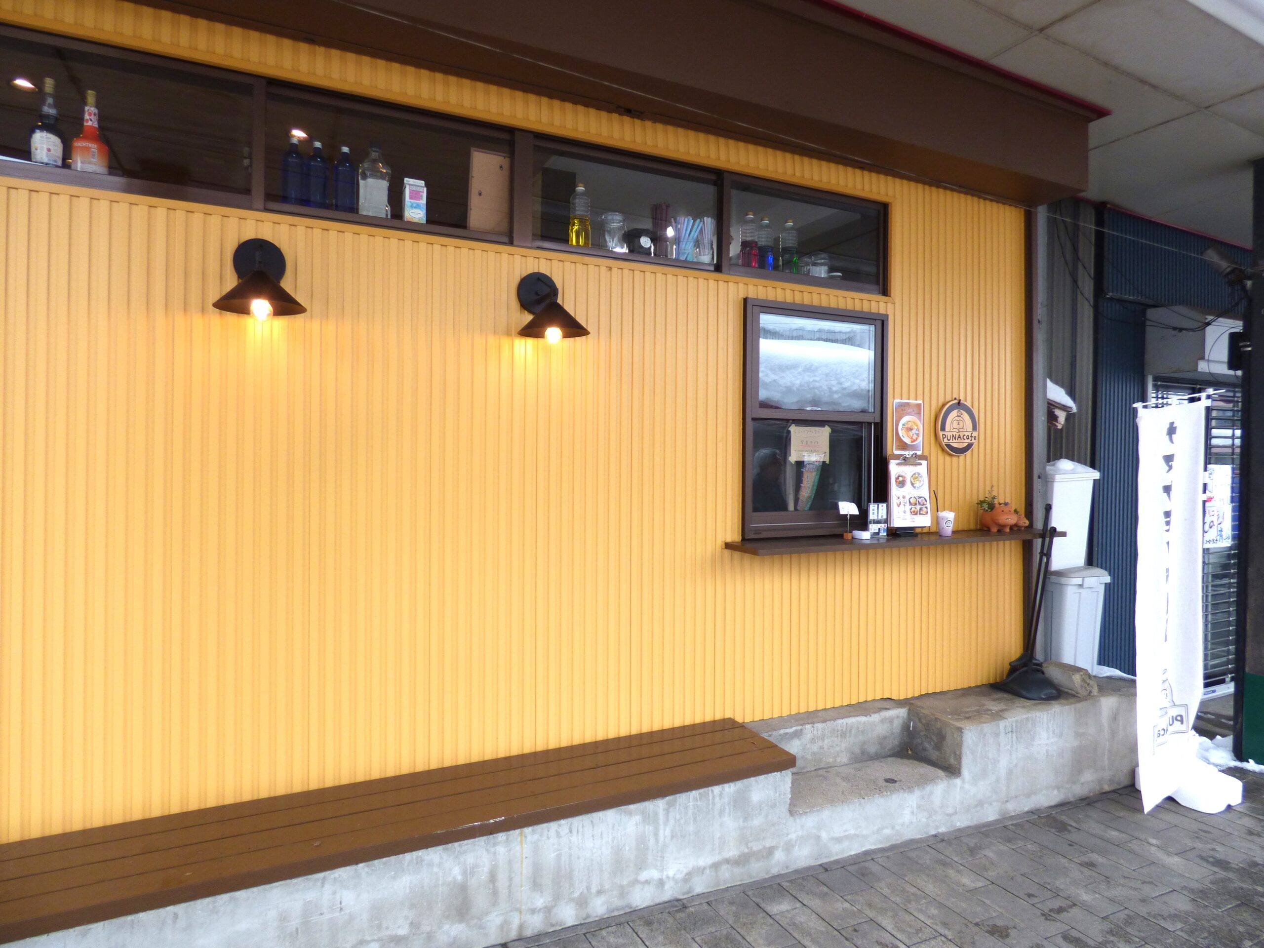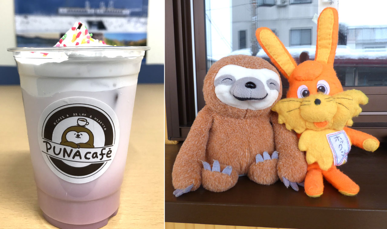 PUNAcafeは、ほくほく線十日町駅下車、東口から徒歩1分の距離にあるかわいいカフェで、黄色のお店とキャラクターであるナマケモノの「プナンくん」が目印になっています。