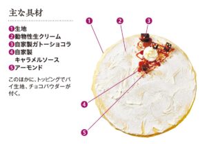 クレープを巻いたらパイ生地、ガトーショコラ、生クリーム、アーモンド、キャラメルソース、チョコパウダーを追加して完成