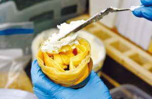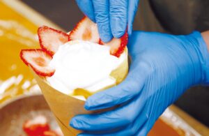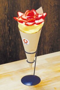 メニュー数の多さと、迫力ある見た目に圧倒されるパーラーやお家。「農産物直売所が運営するパーラーなので、一番の強みは新鮮でおいしい果物や野菜を使ったスイーツを提供できることです」とスタッフの川上愛さん。クレープは今年に入ってから米粉入り生地にリニューアルし、もちもち感がアップ。クリームも甘さを控えめにし、最後までおいしく食べられるよう改良した。春の一番人気は「越後姫お花クレープ」。契約農家からその日に届いたイチゴを使い、グラノーラやナッツを食感のアクセントに。巻き方にもこつがあり、食べた時の食感が計算されている。