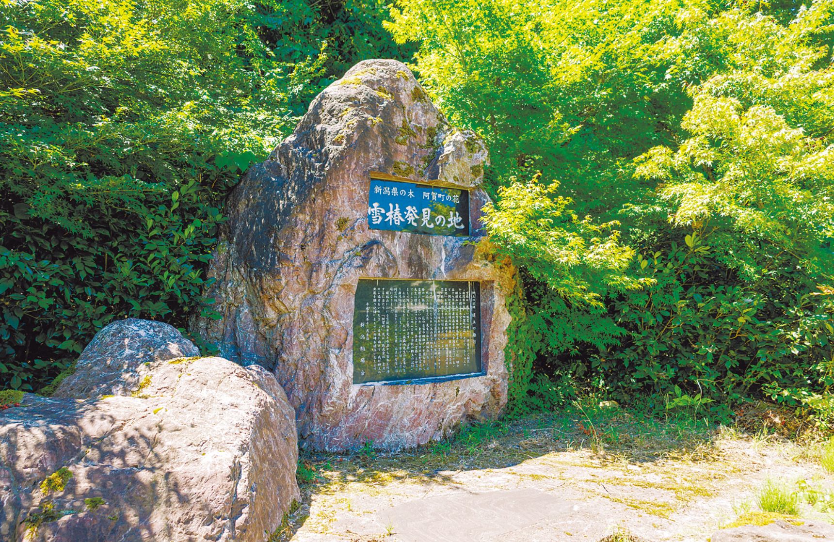 麒麟山いこいの森公園に立つ「雪椿発見の地碑」。発見から100年後の2006年に雪椿は「阿賀町の花」に制定され、その1年後に碑が建立された
