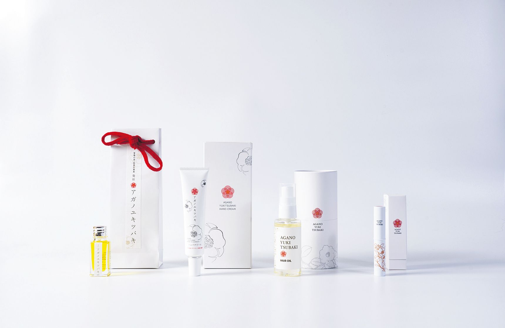「アガノユキツバキ」の商品ラインアップ。左からプレミアムオイル(3,240円)、ハンドクリーム(1,980円)、ヘアオイル(2,860円)、リップクリーム(1,320円)