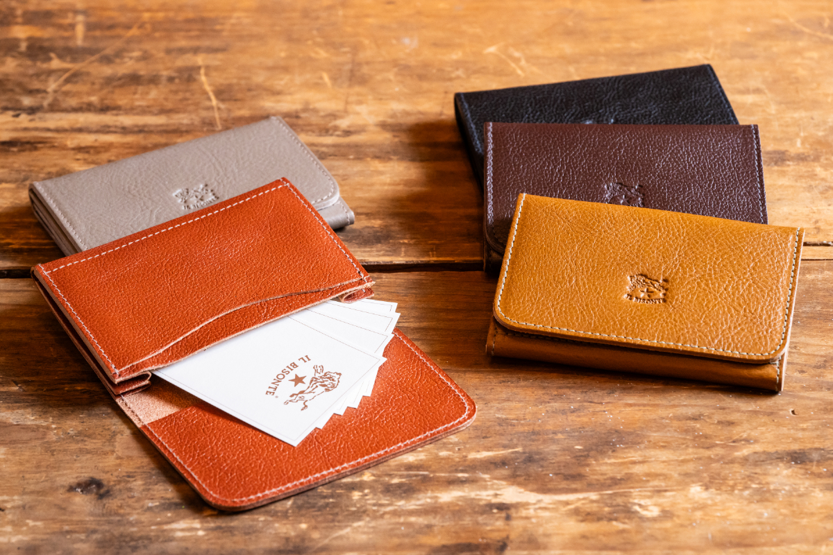 イル ビゾンテは、長い歴史を持つイタリア発のレザーブランド。フィレンツェ郊外のワインセラーをイメージした店内には、熟練の職人が上質な牛革を使って作ったバッグや財布が並ぶ。ミニマルなデザインのスクエア型トートバッグは、マチ幅が広く、厚みのあるA4ファイルやペットボトルも余裕を持って収納可能。使う人の性別や年齢、オンオフなどのシーンを問わず、さまざまな着こなしに取り入れられる。また、流行に左右されないベーシックなデザインのカードケースは、新生活を始める人へのギフトにもお薦めだ。こちらもマチ幅があり、20~30枚ほどの名刺が入る。耐久性に優れ、使い込むほどに味わいや深みを増し、経年変化を楽しむことができる。