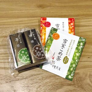 雪室貯蔵でうまみや甘みを引き出したティーバッグタイプのこめ茶・紅茶と、雪室で熟成させた抹茶とコーヒー豆の香りを生かし、丁寧に仕立てたようかんのセット。今月号の「地元の推しコレ」で登場した、さくら百嘉店・発酵プラス(上越市)でも販売中。